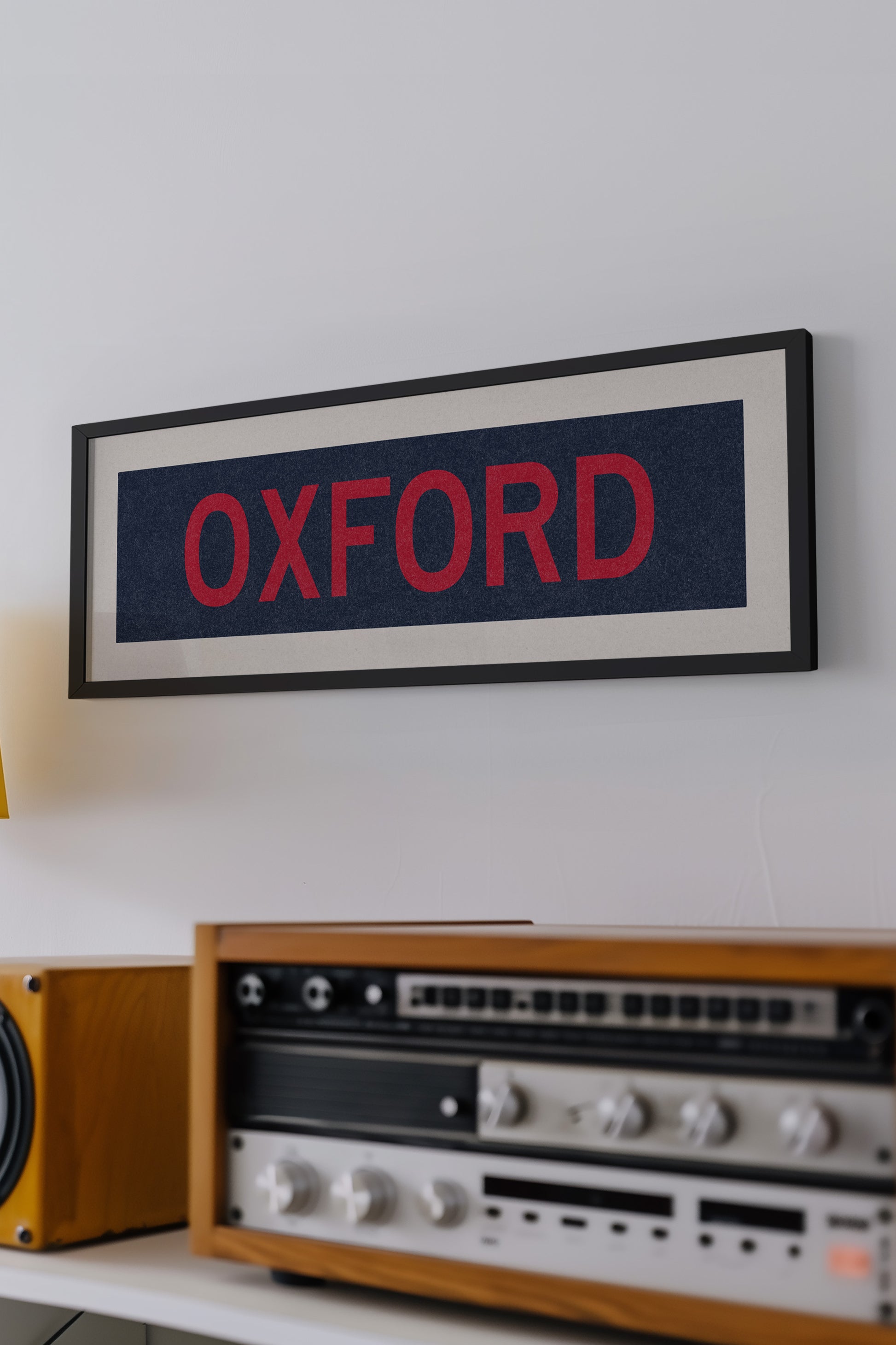 Framed red and navy "OXFORD" vintage bus/train scroll sign art. Show off your love for Oxford, Mississippi with this classic and simple framed scroll sign. Perfect for above the door, in an office, game room or accent in a living area.