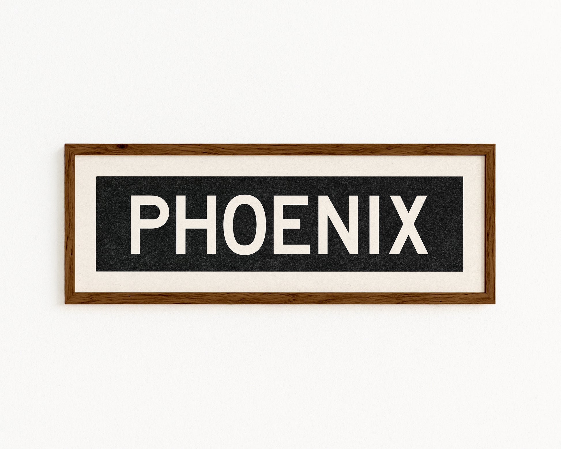 Framed black and white "PHOENIX" vintage bus/train scroll sign art. Show off your love for Phoenix, Arizona with this classic and simple framed scroll sign. Great gift for the native or the newcomer. Perfect for above the door, in an office, game room or accent in a living area.