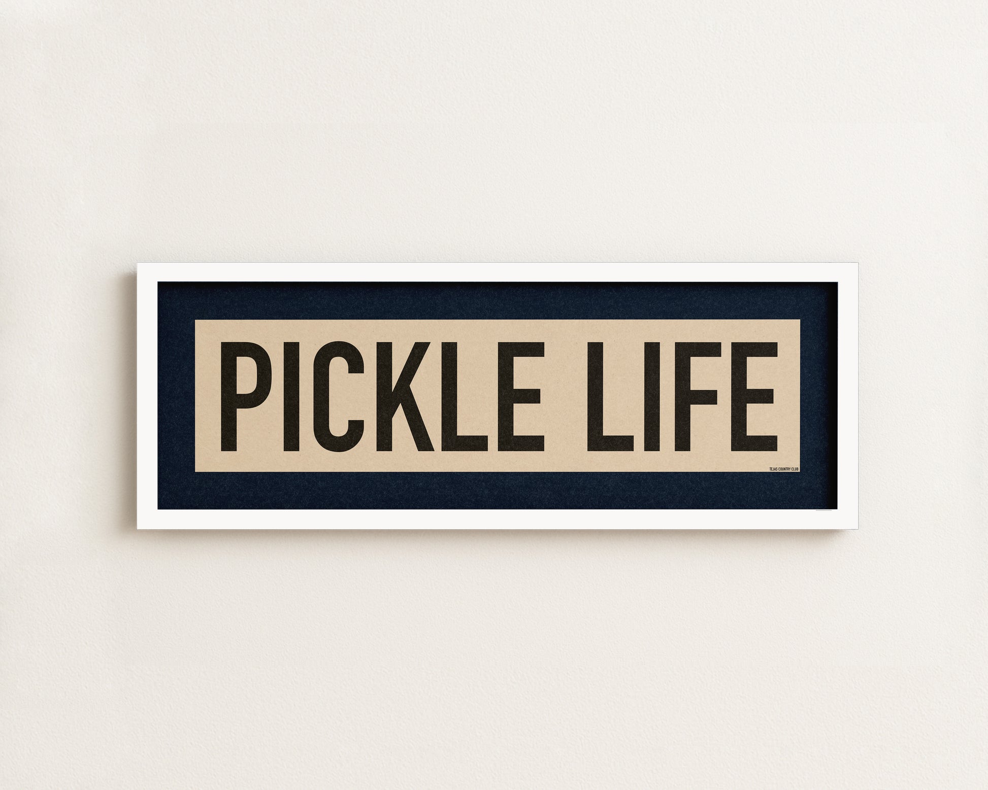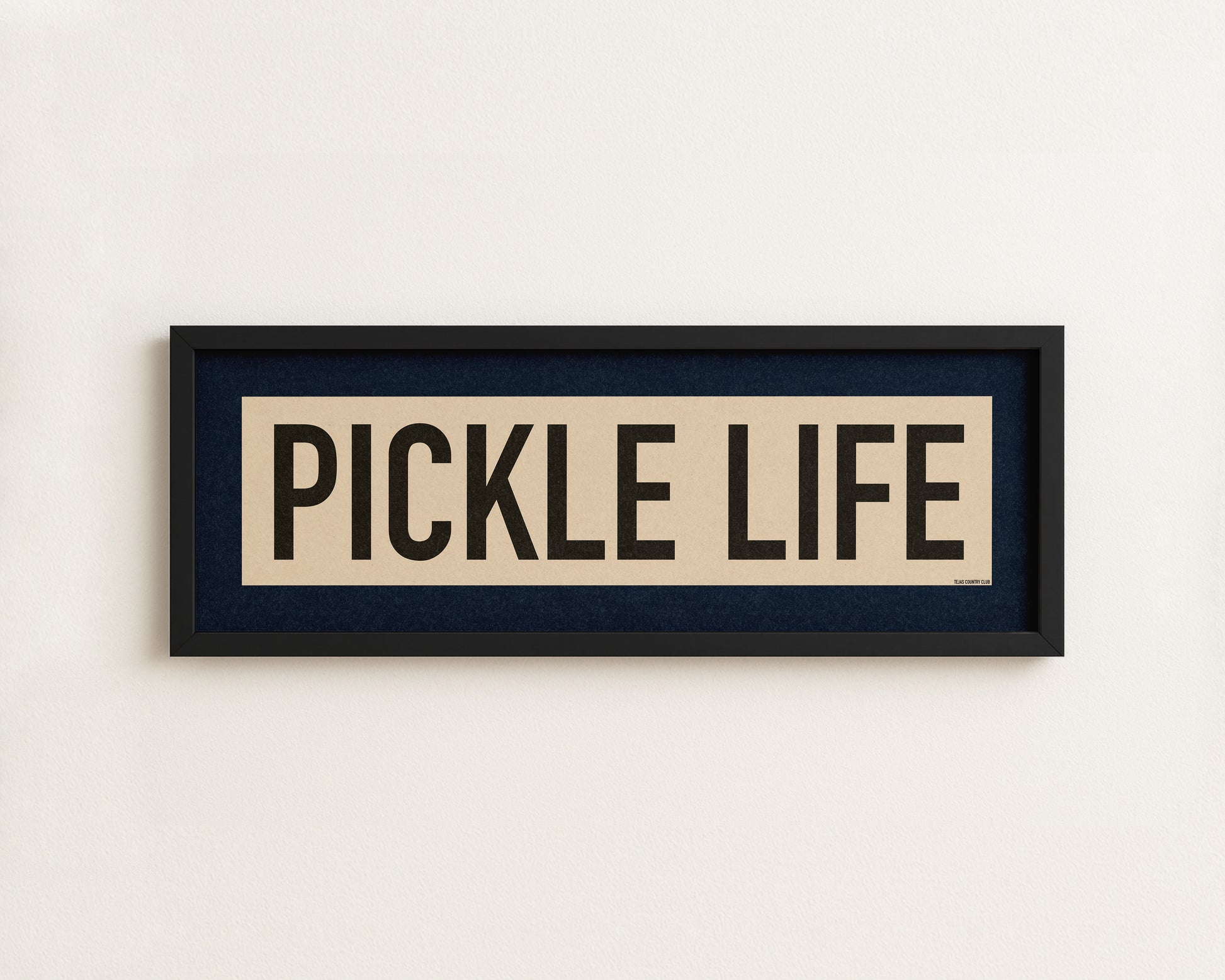 Framed navy and off white "PICKLE LIFE" vintage scroll sign art. Show off your love for the amazing sport we all know and love! It's a lifestyle! Represent it with this classic and simple framed scroll sign. Perfect for above the door, in an office, game room or accent in a living area.