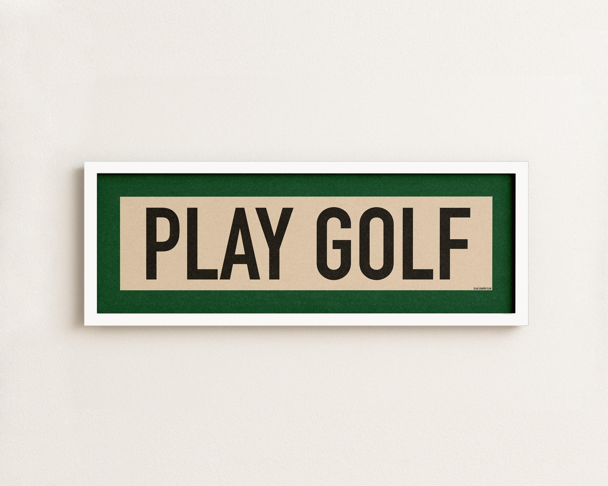 Framed green and off white "PLAY GOLF" vintage scroll sign art. Show off your love for the golf with this classic and simple framed scroll sign. Perfect for above the door, in an office, game room or accent in a living area.