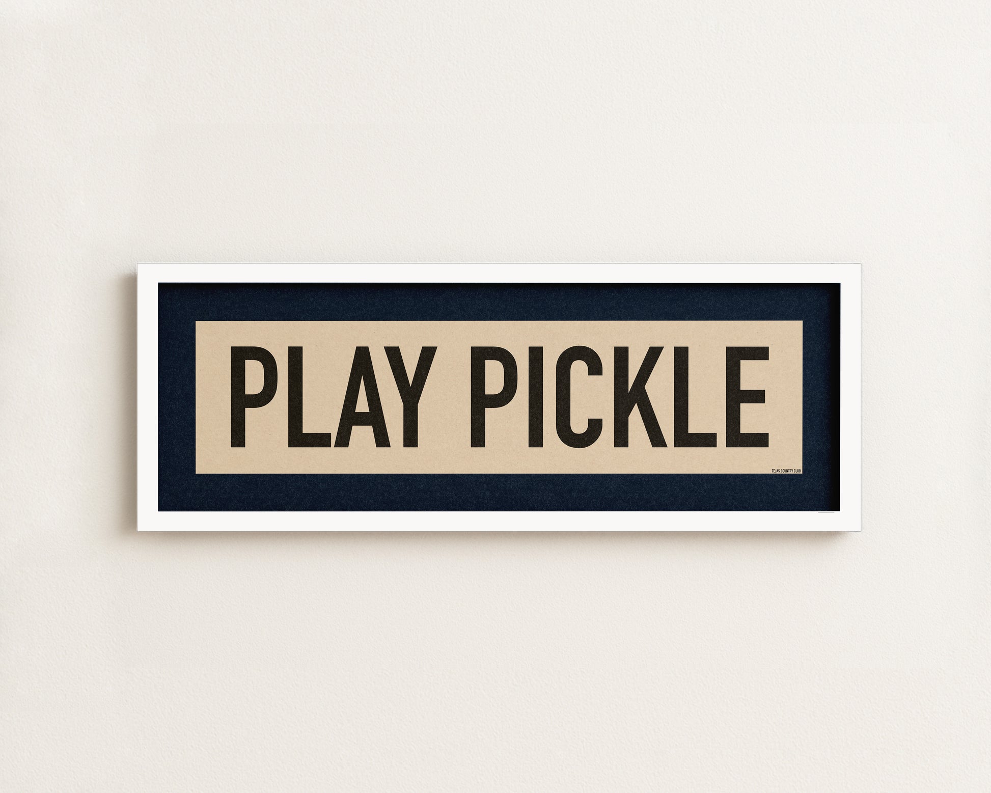 Framed navy and off white "PLAY PICKLE" vintage scroll sign art. Show off your love for playing pickleball with this classic and simple framed scroll sign. Perfect for above the door, in an office, game room or accent in a living area.