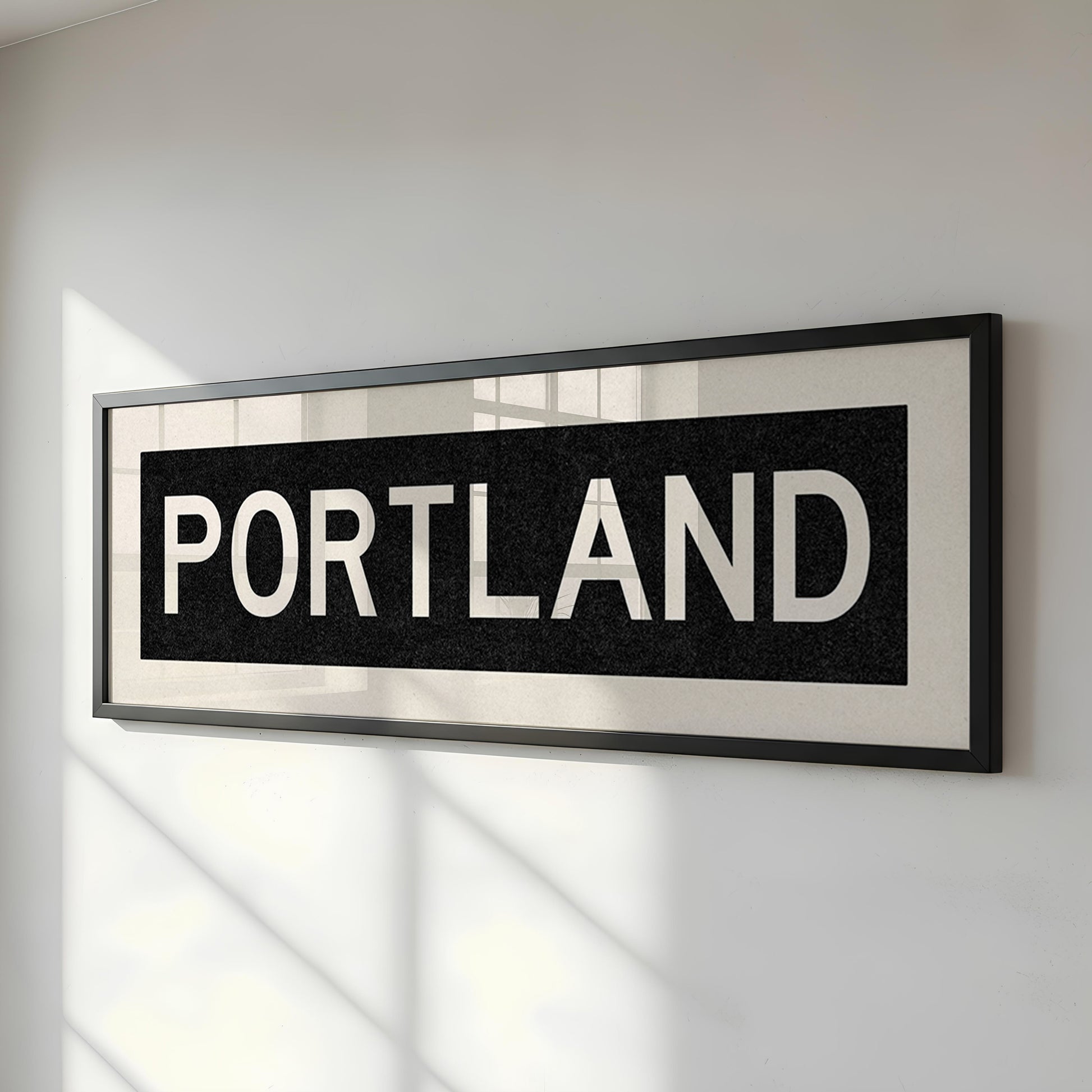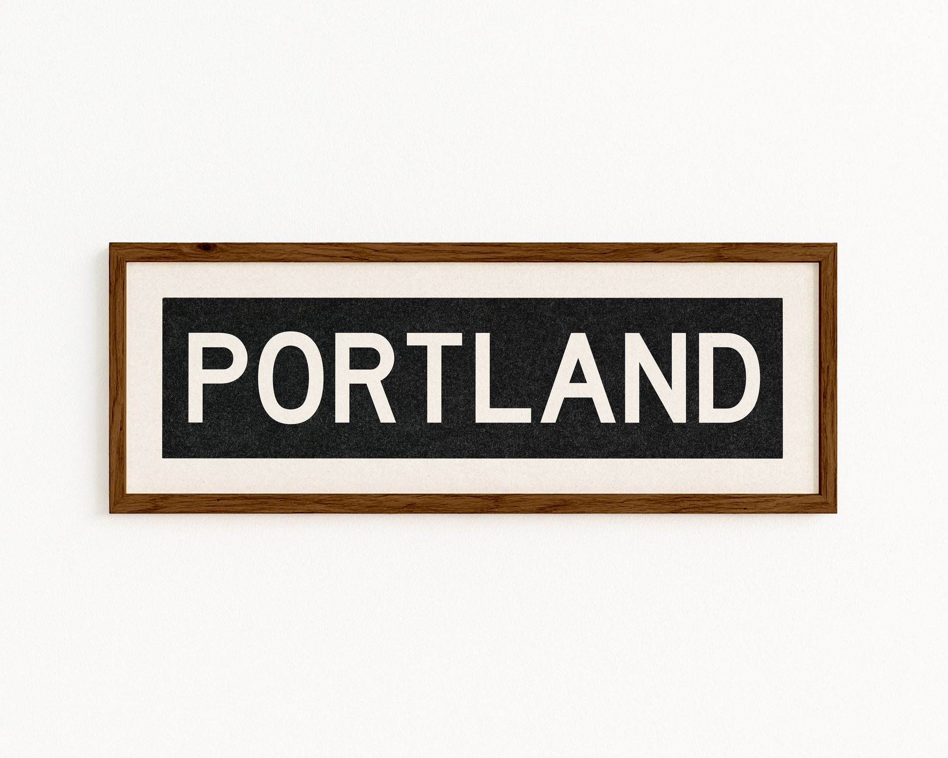 Framed black and white "PORTLAND" vintage bus/train scroll sign art. Show off your love for Portland, Oregon with this classic and simple framed scroll sign. Great gift for the native or the newcomer. Perfect for above the door, in an office, game room or accent in a living area.