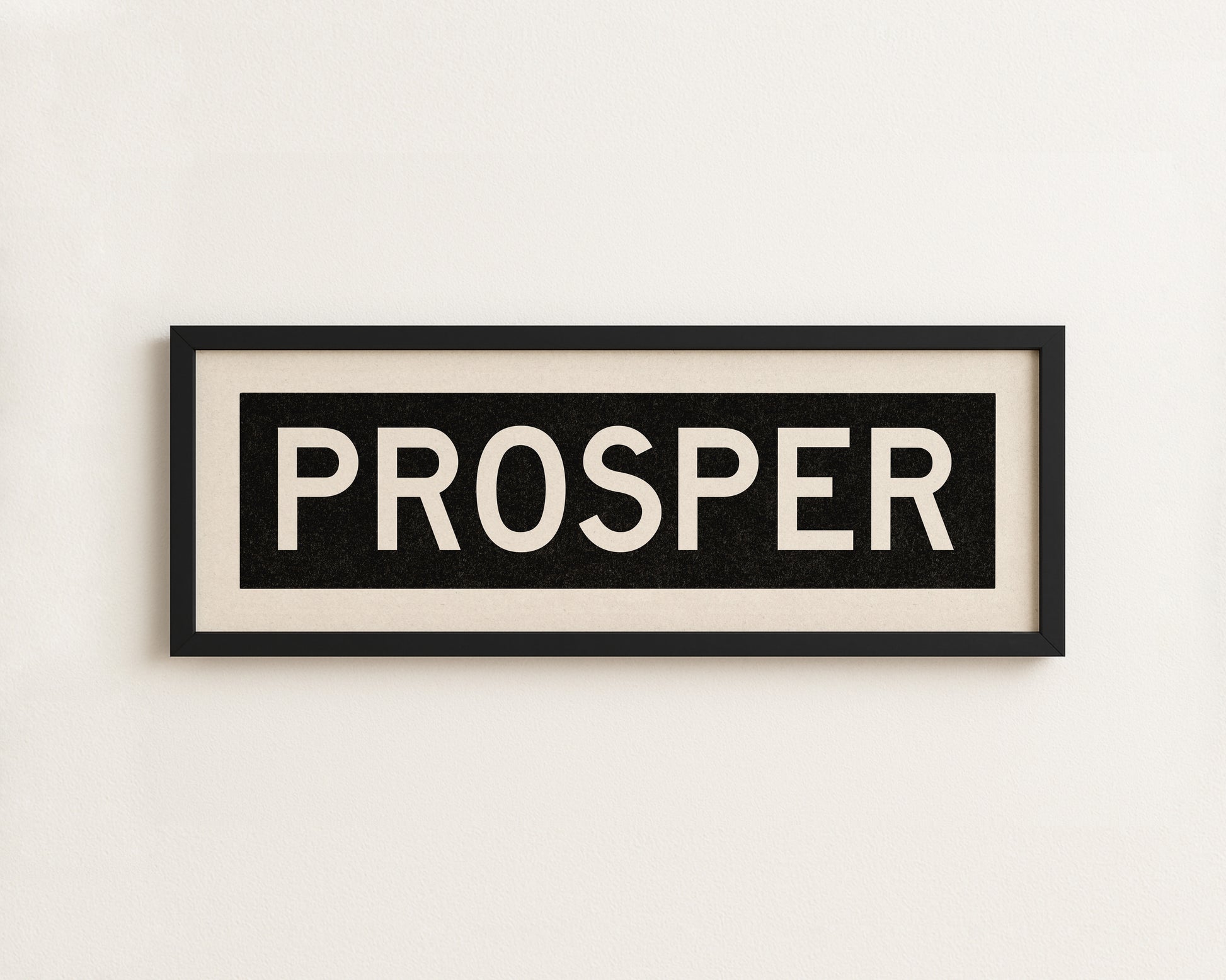 Framed "PROSPER" vintage bus/train scroll sign art. Show off your love for Prosper with this classic and simple framed scroll sign. Perfect for above the door, in an office, game room or accent in a living area.