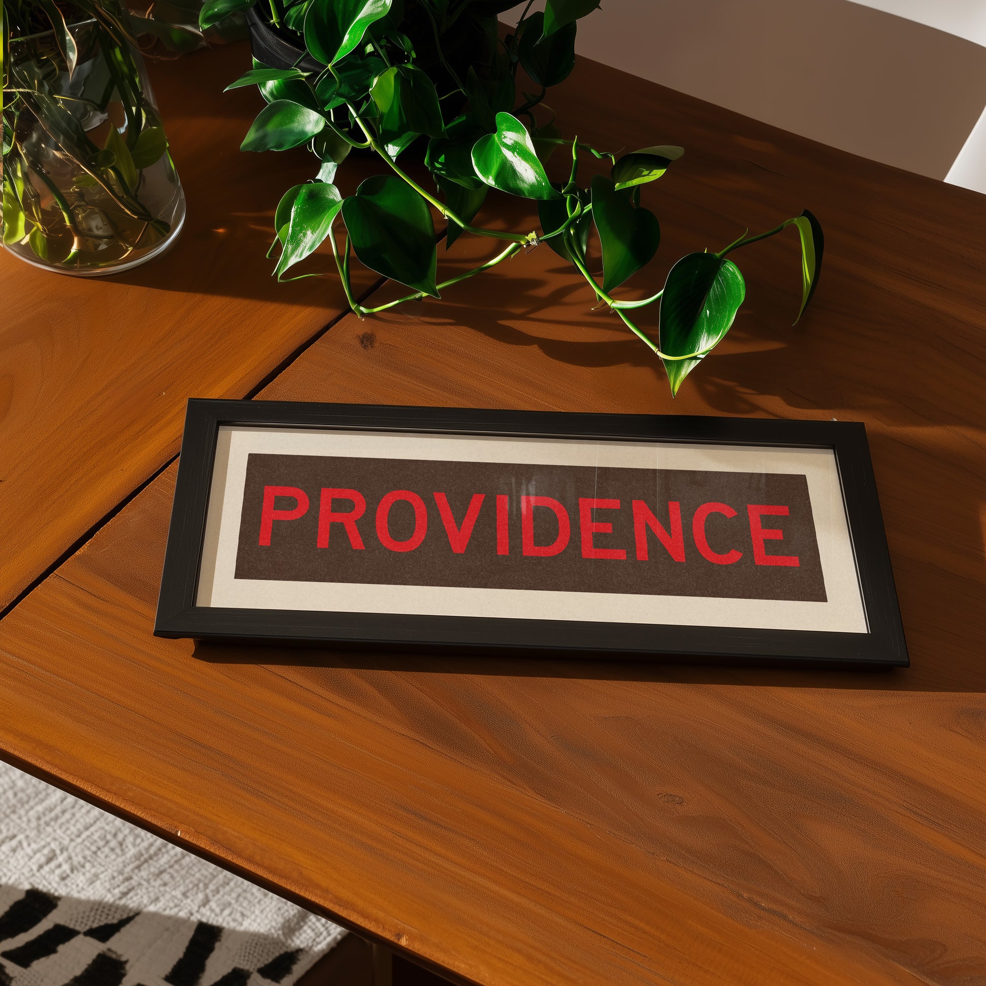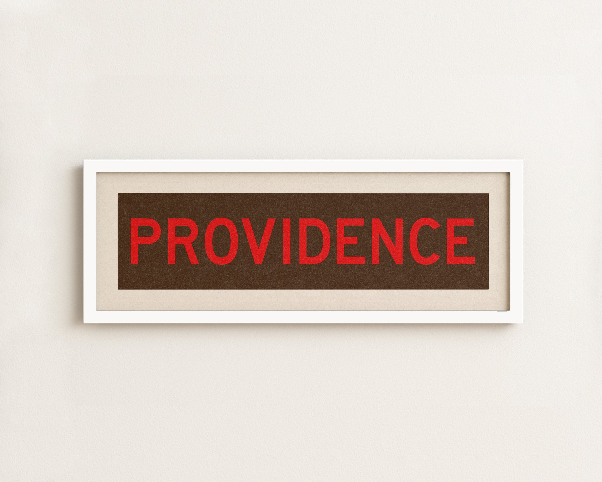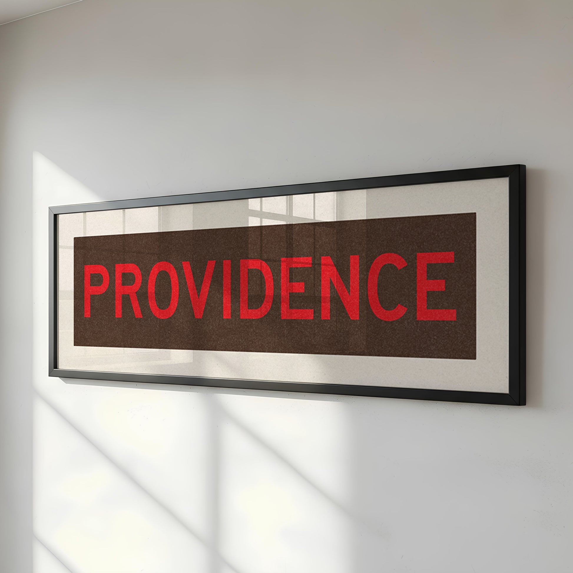 Framed brown and red "PROVIDENCE" vintage bus/train scroll sign art. Show off your love for Providence, Rhode Island with this classic and simple framed scroll sign. Perfect for above the door, in an office, game room or accent in a living area.