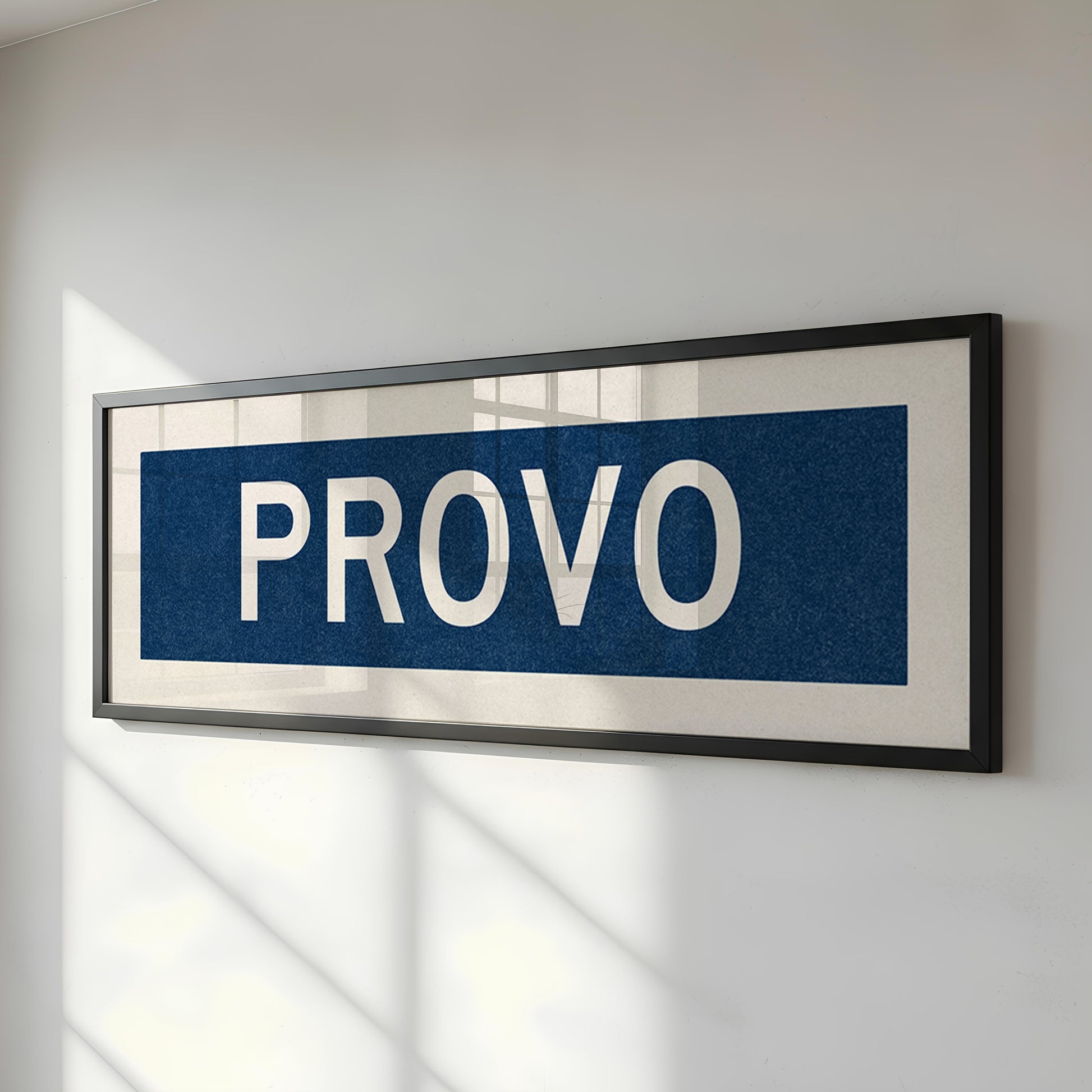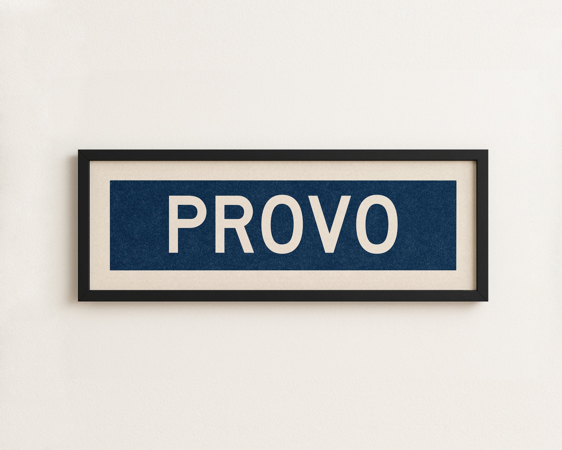 Framed navy and white "PROVO" vintage bus/train scroll sign art. Show off your love for Provo, Utah with this classic and simple framed scroll sign. Perfect for above the door, in an office, game room or accent in a living area.