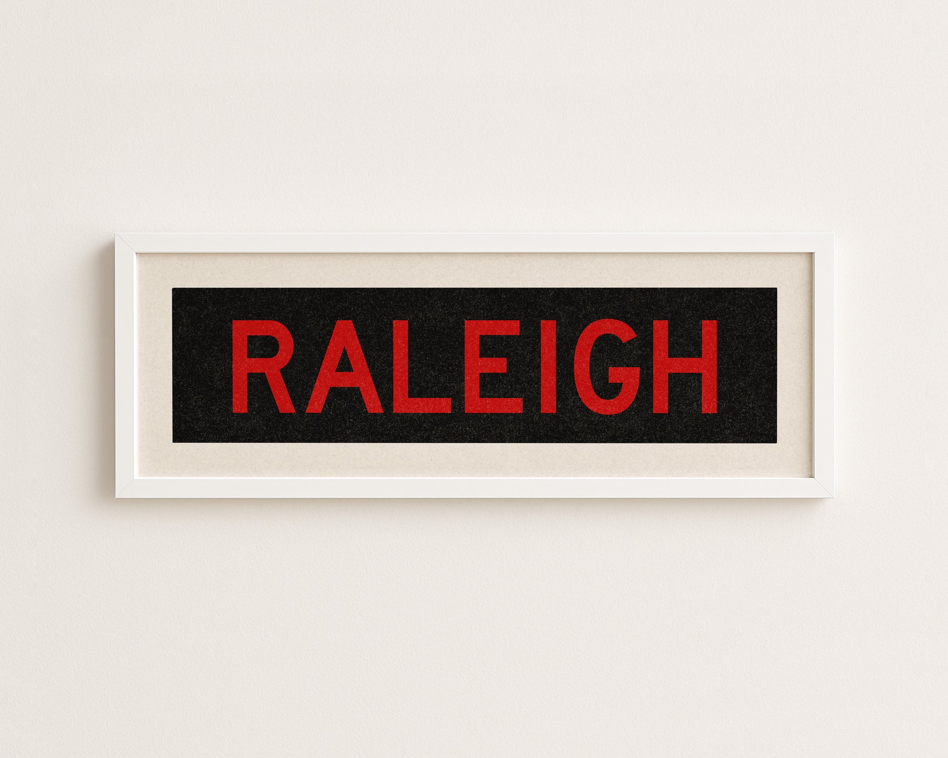 Framed red and black "RALEIGH" vintage bus/train scroll sign art. Show off your love for Raleigh, North Carolina with this classic and simple framed scroll sign. Perfect for above the door, in an office, game room or accent in a living area.