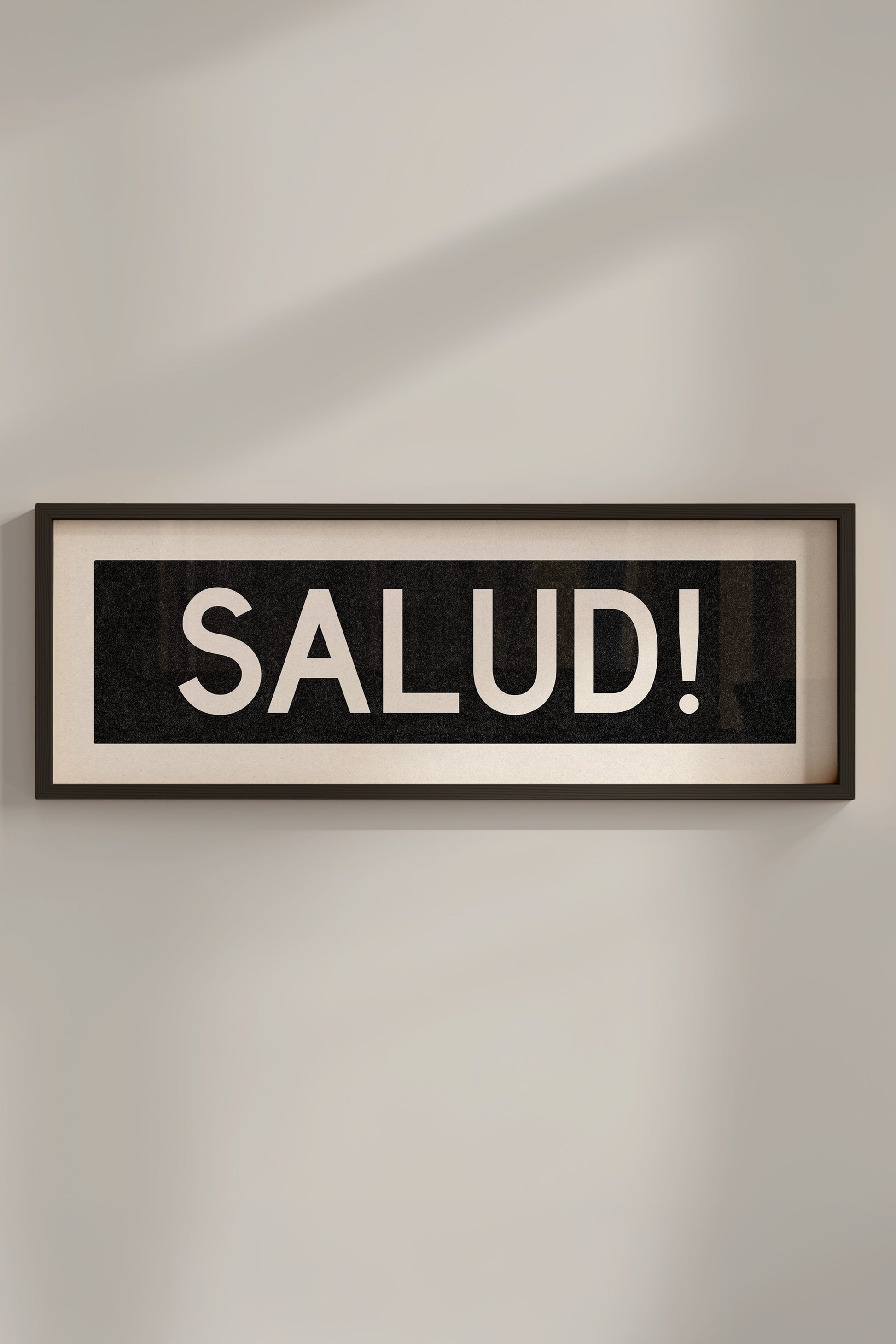 Framed SALUD!" vintage bus/train scroll sign art. Show off your love for saying cheers with your crew with this classic and simple framed scroll sign. Perfect for above the door, in an office, above the bar, game room or accent in the kitchen.