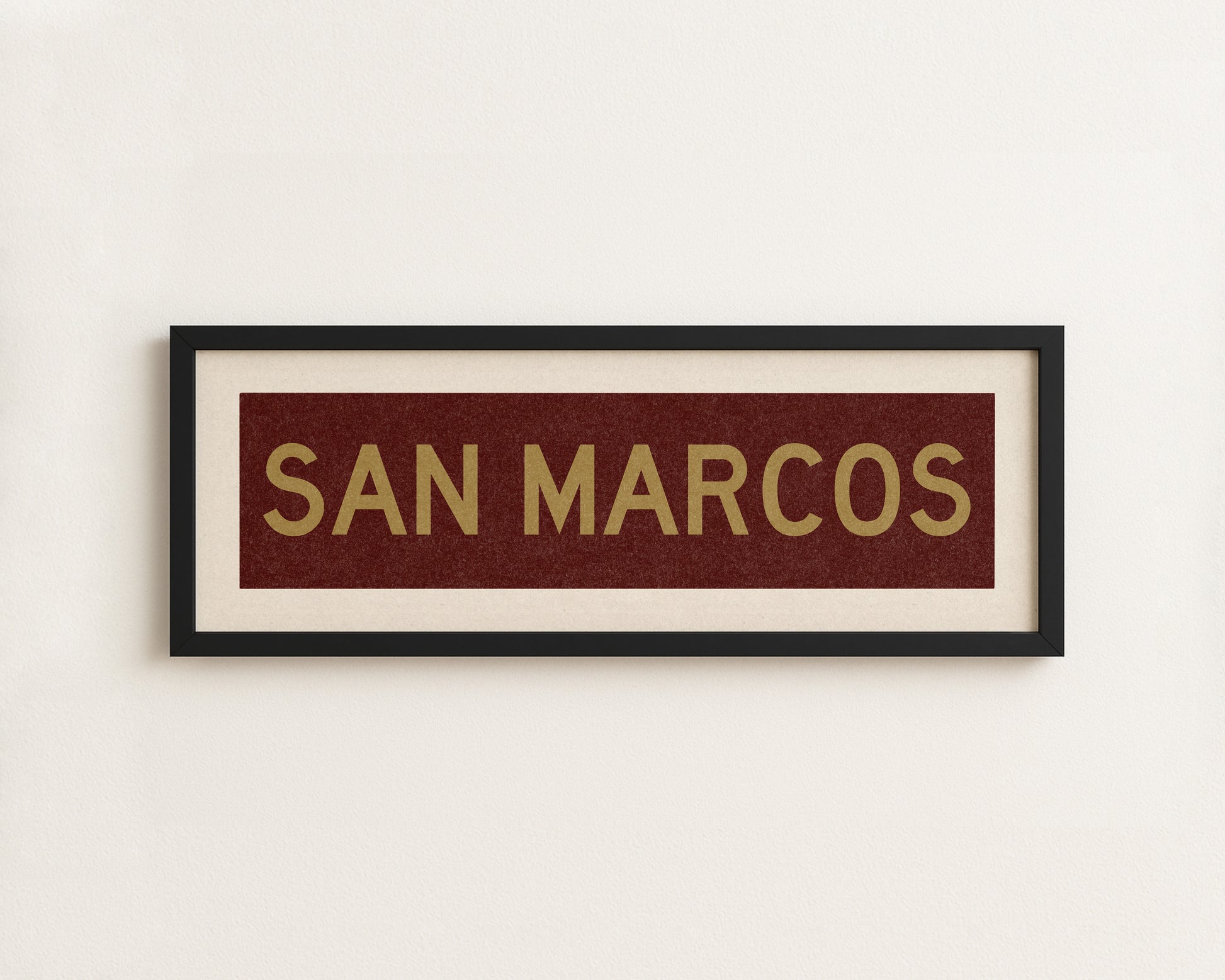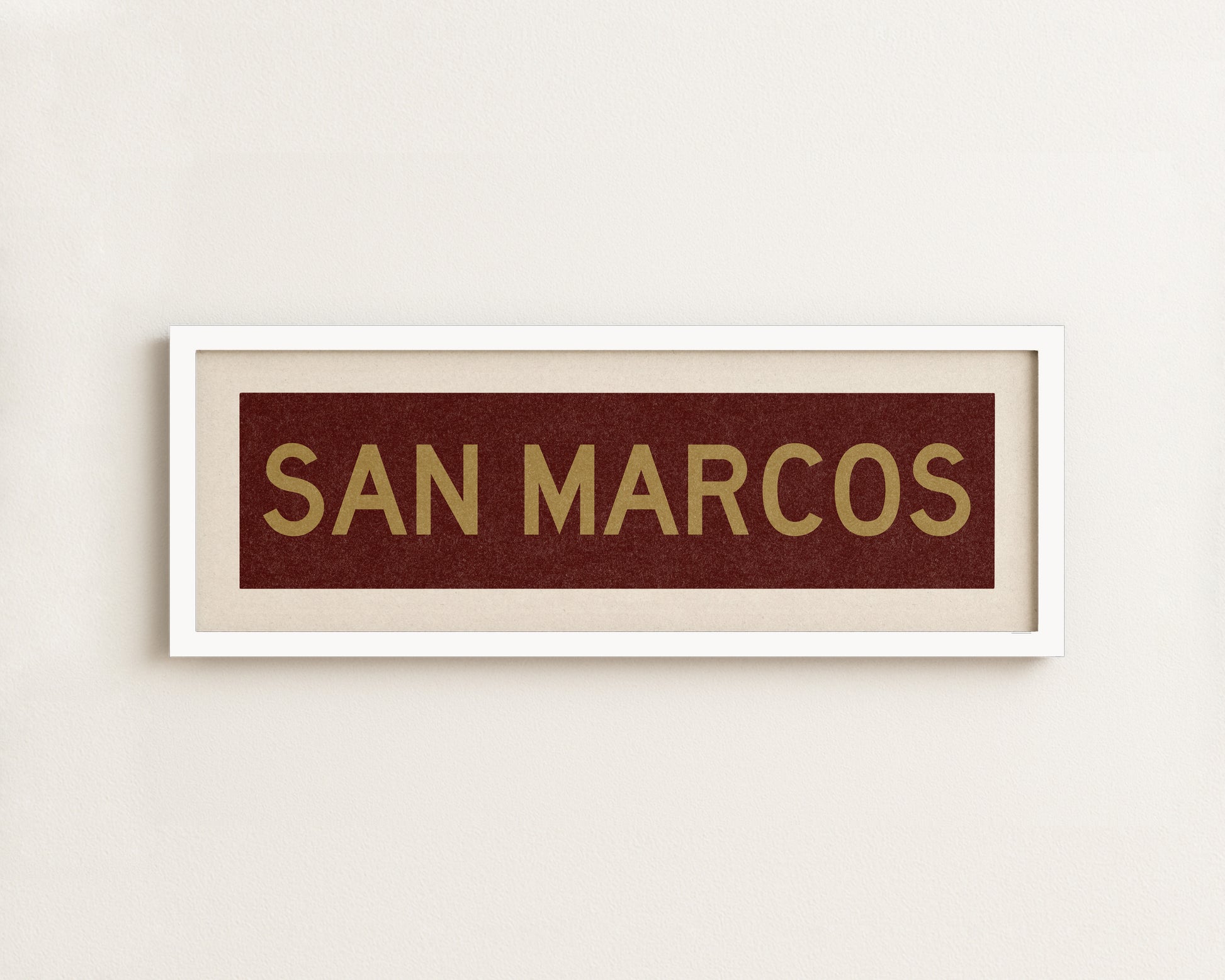 Framed maroon and gold "SAN MARCOS" vintage bus/train scroll sign art. Show off your love for San Marcos, Texas with this classic and simple framed scroll sign. Perfect for above the door, in an office, game room or accent in a living area.