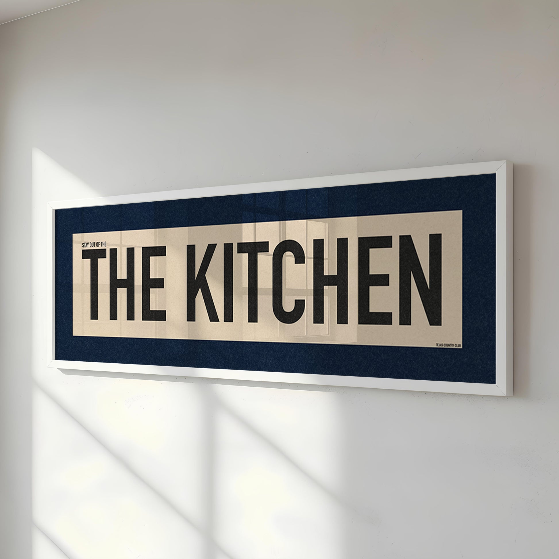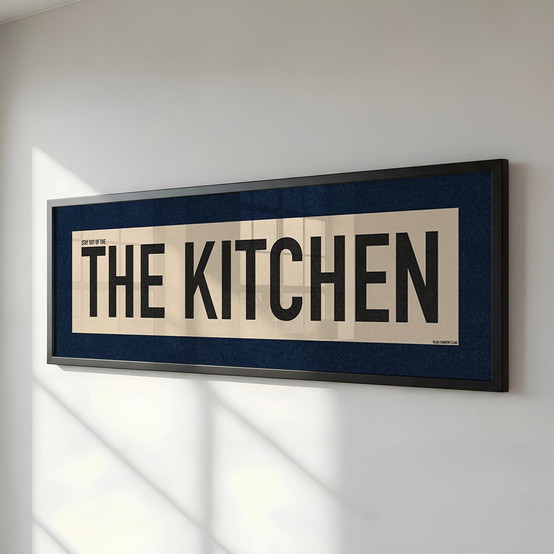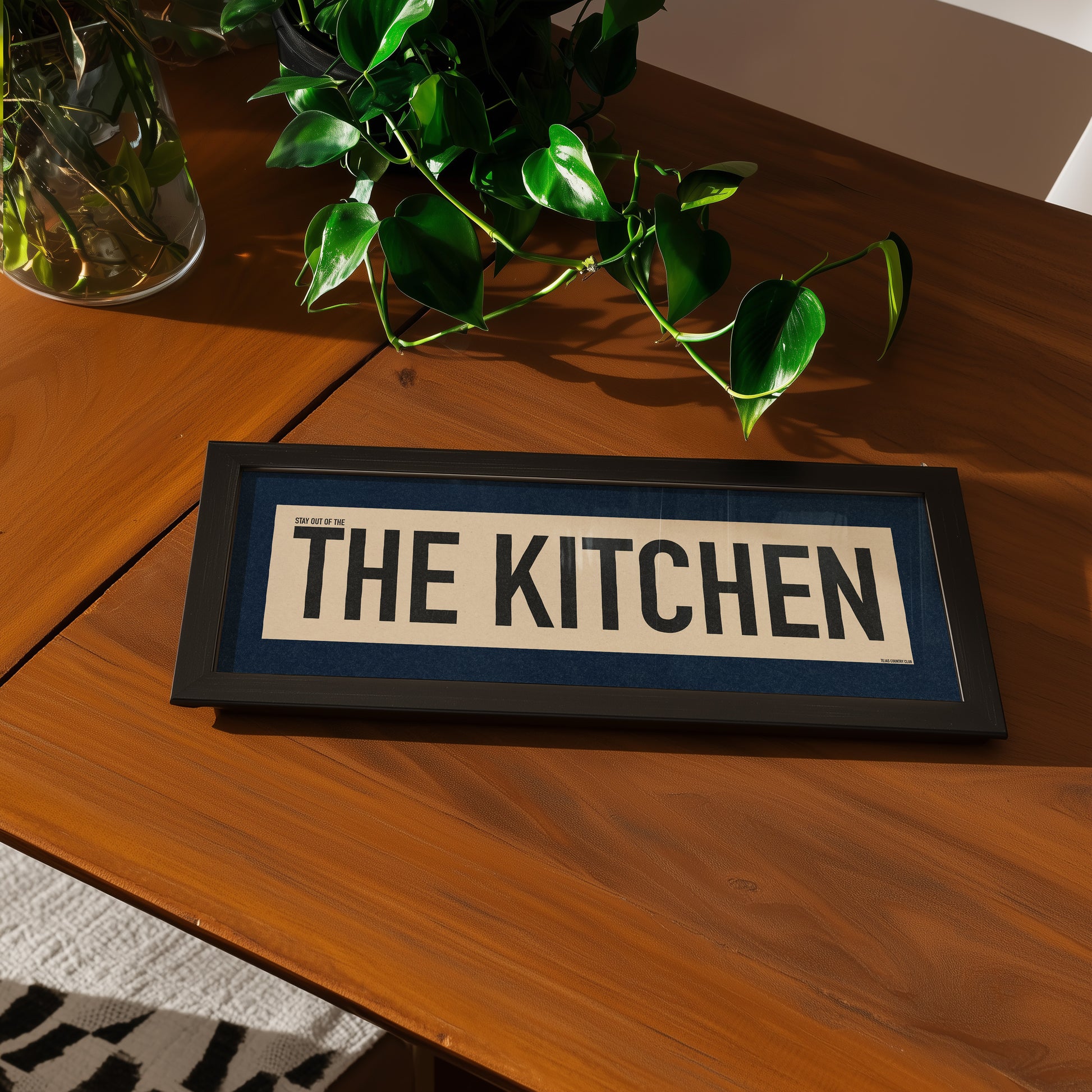Framed navy and off white "STAY OUT OFTHE KITCHEN" vintage scroll sign art. Show off your love for Pickleball with this classic and simple framed scroll sign. Stay out of the kitchen! It's the law. Perfect for above the door, in an office, game room or accent in a living area.
