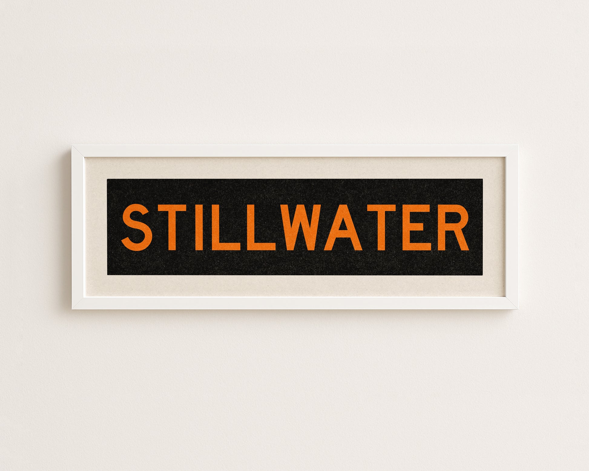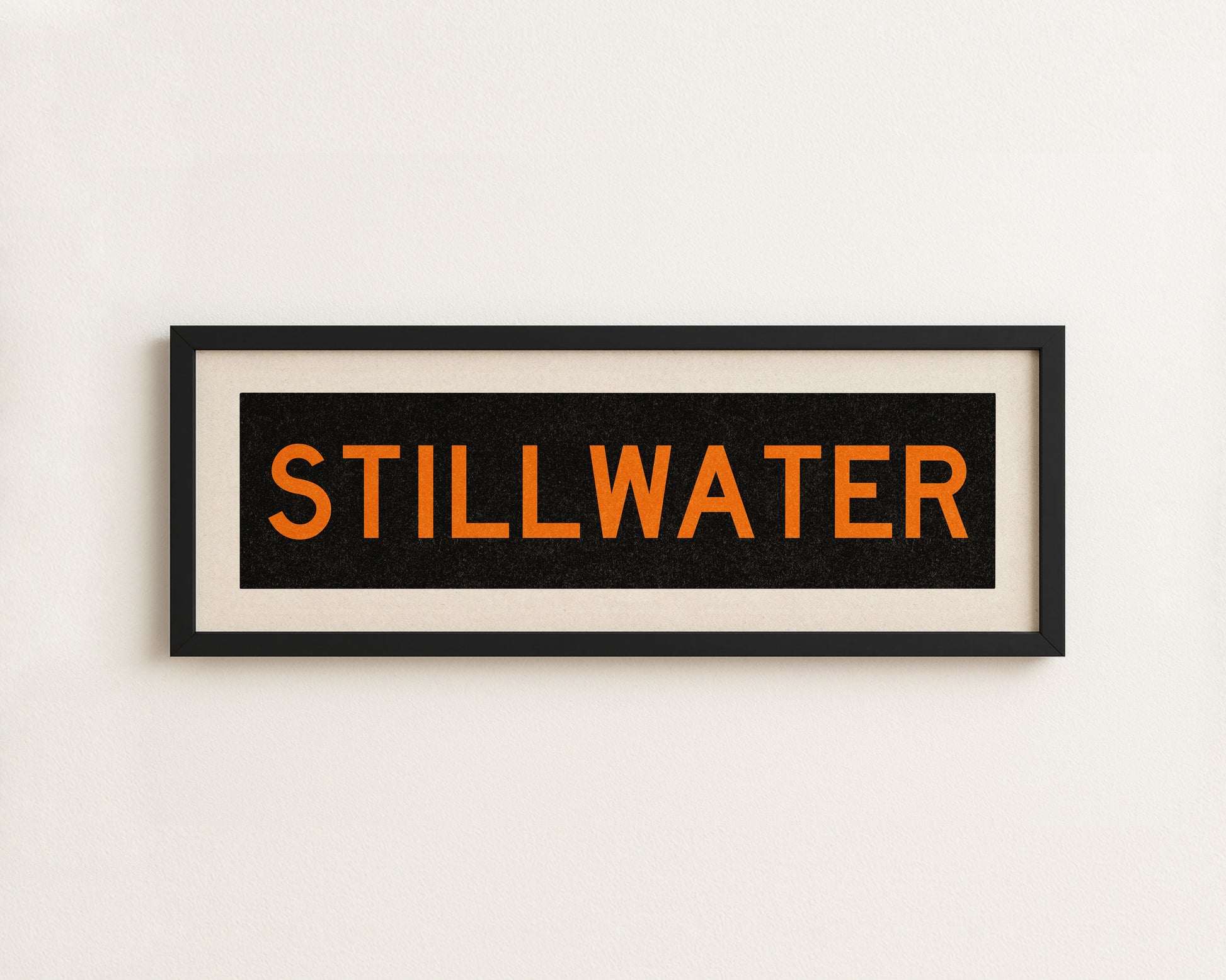 Framed orange and black "STILLWATER" vintage bus/train scroll sign art. Show off your love for Stillwater, OK with this classic and simple framed scroll sign. Perfect for above the door, in an office, game room or accent in a living area.