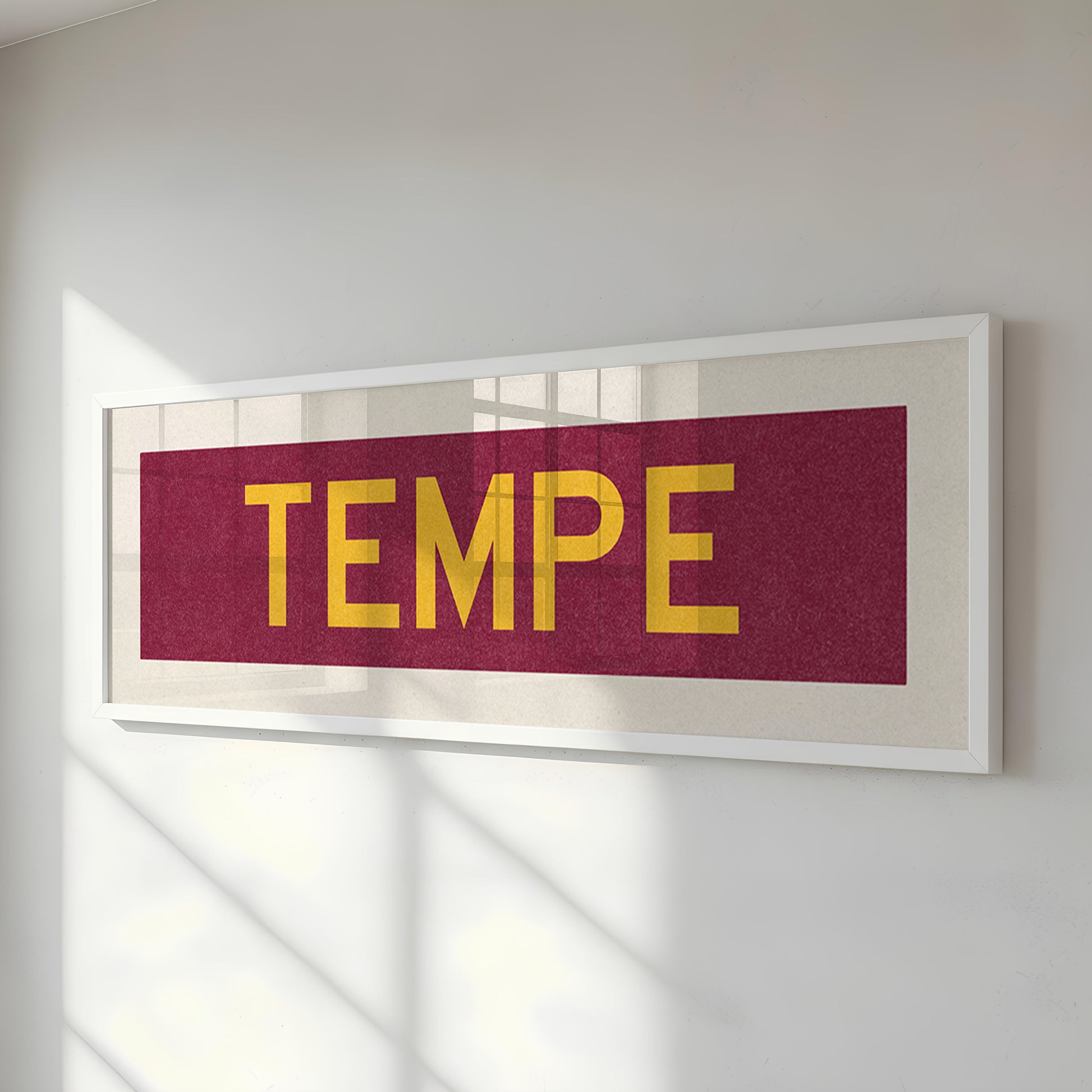 Framed maroon "TEMPE" vintage bus/train scroll sign art. Show off your love for Tempe, Arizona with this classic and simple framed scroll sign. Perfect for above the door, in an office, game room or accent in a living area.