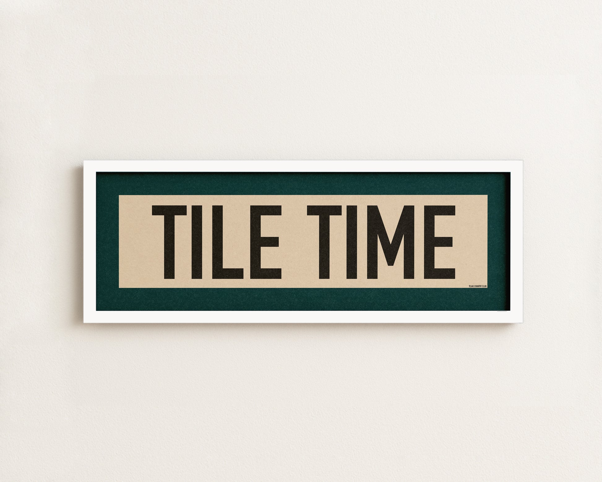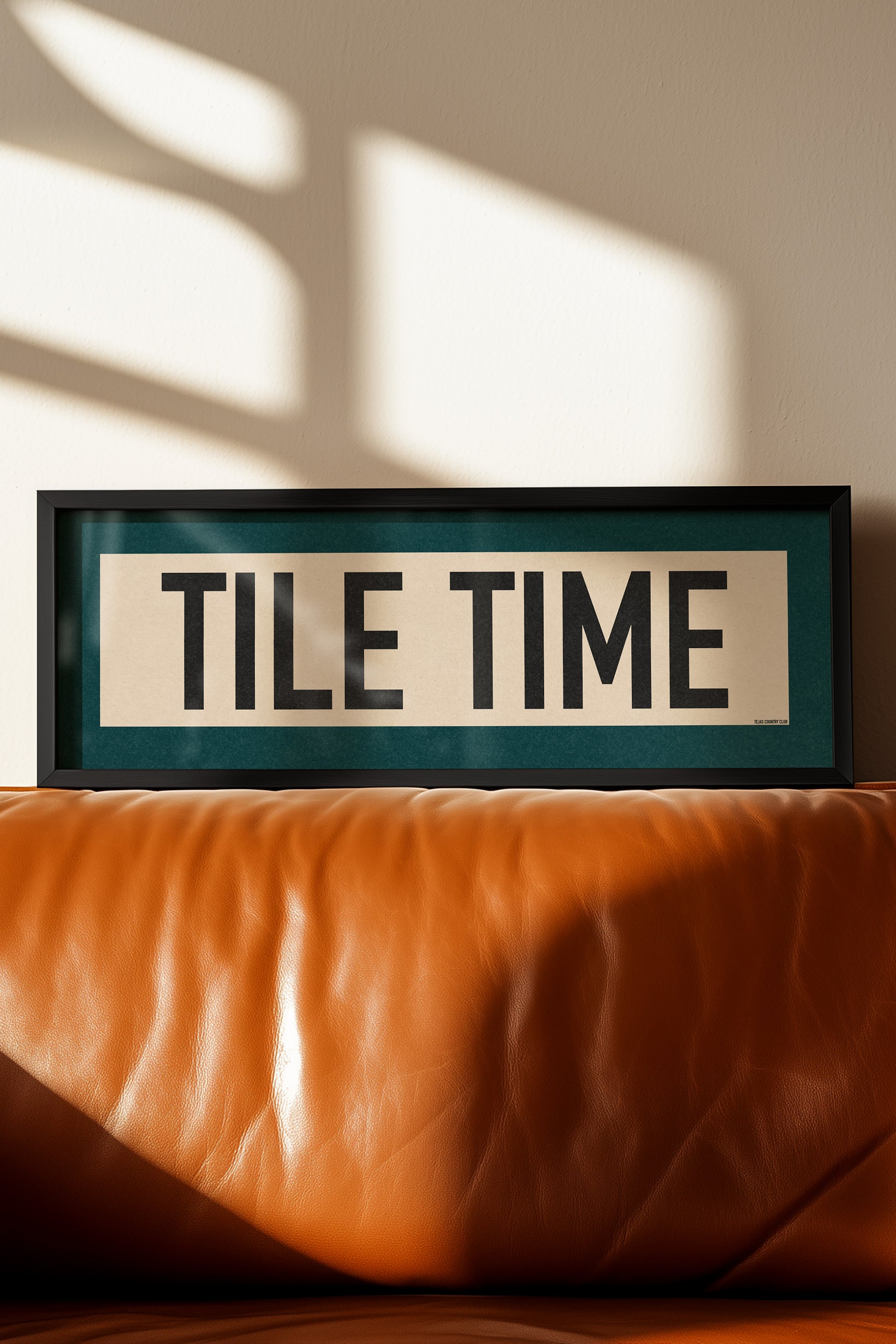 Framed teal and off white "TILE TIME" vintage scroll sign art. You know what time it is! It's Tile Time, otherwise known as time to play Mahjong. It's always Tile Time around here! Liven up that wall with this classic and simple framed scroll sign. for above the door, in an office, game room or accent in a living area.