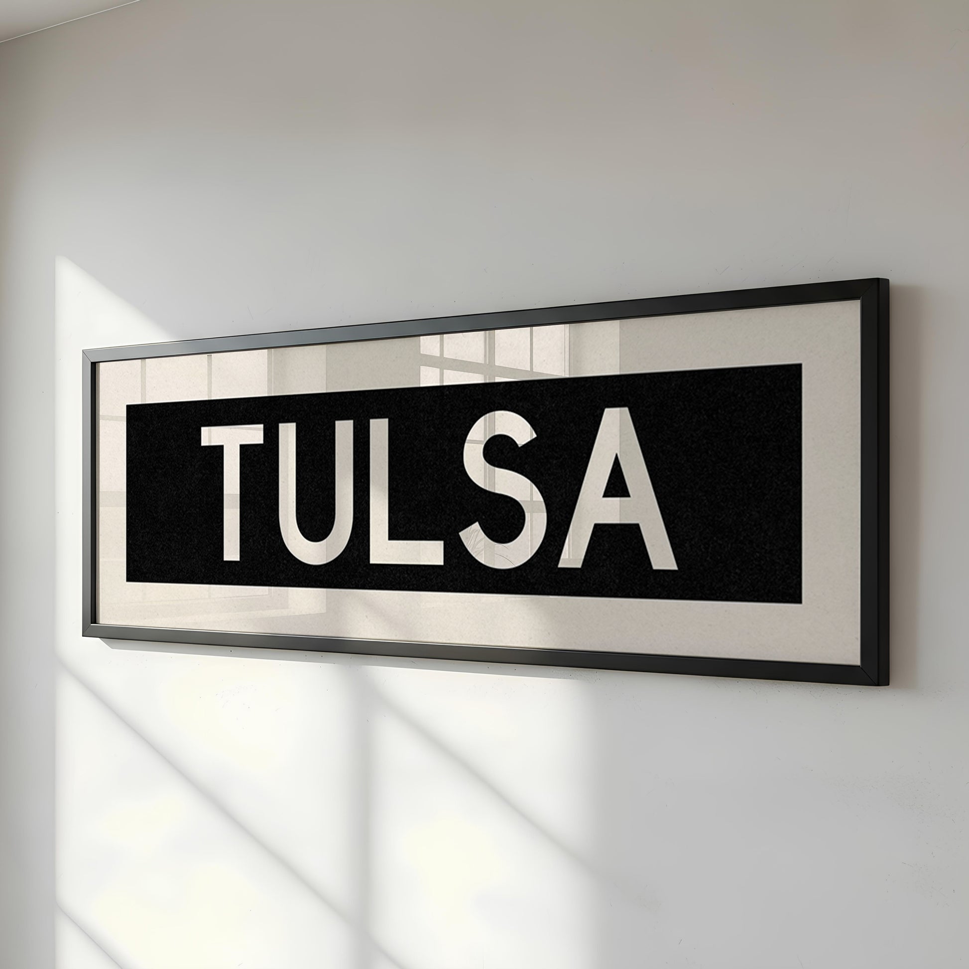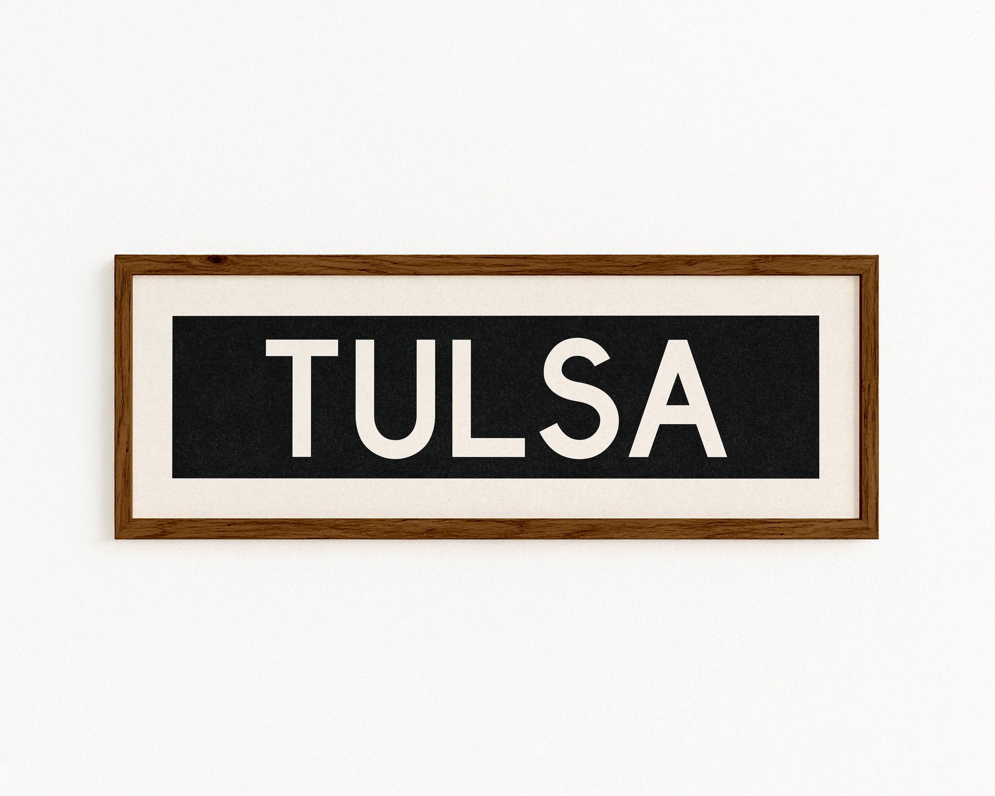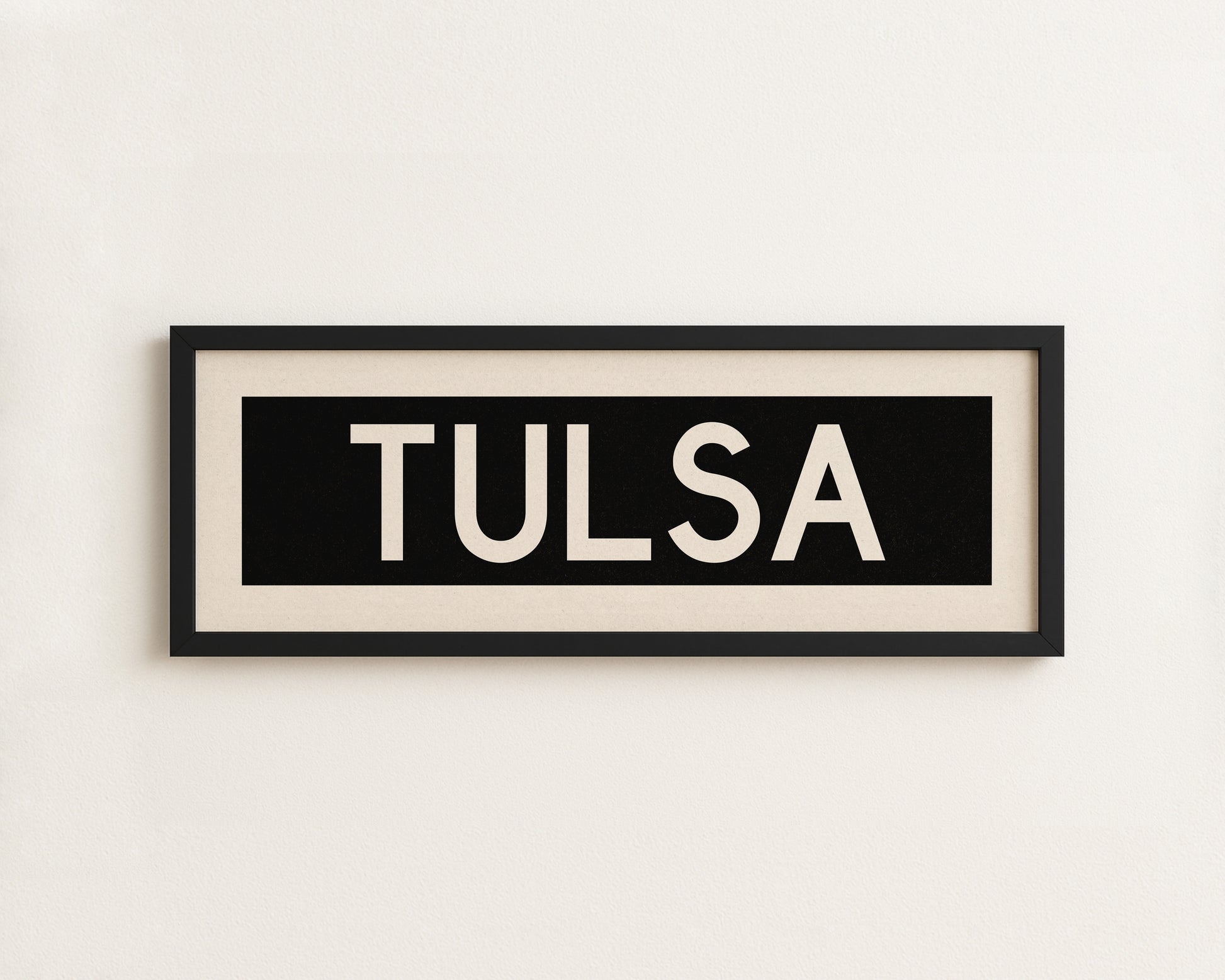 Framed black and white "TULSA" vintage bus/train scroll sign art. Show off your love for Tulsa, Oklahoma with this classic and simple framed scroll sign. Great gift for the native or the newcomer. Perfect for above the door, in an office, game room or accent in a living area.