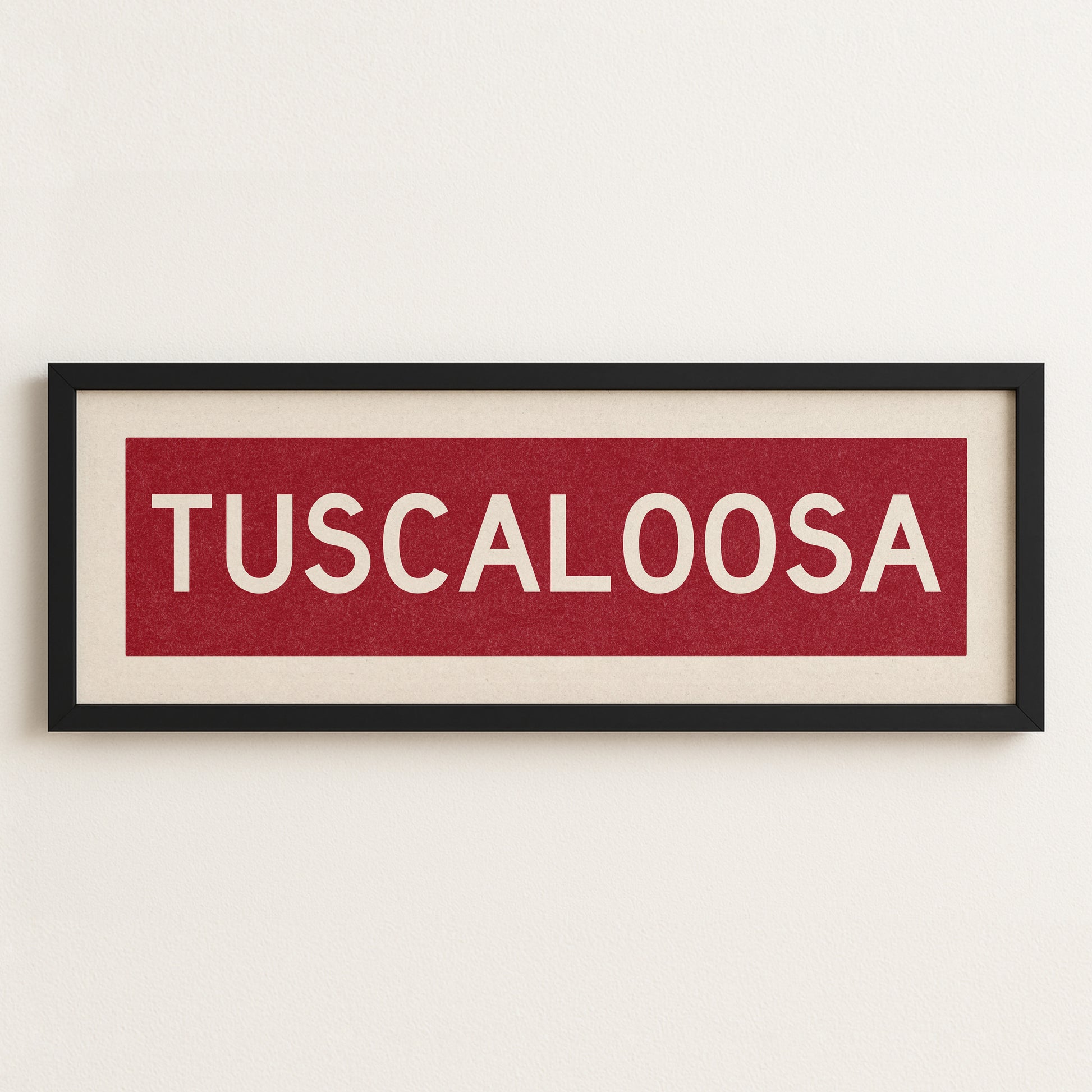 Framed scarlet "TUSCALOOSA" vintage bus/train scroll sign art. Show off your love for Tuscaloosa, Alabama with this classic and simple framed scroll sign. Perfect for above the door, in an office, game room or accent in a living area.