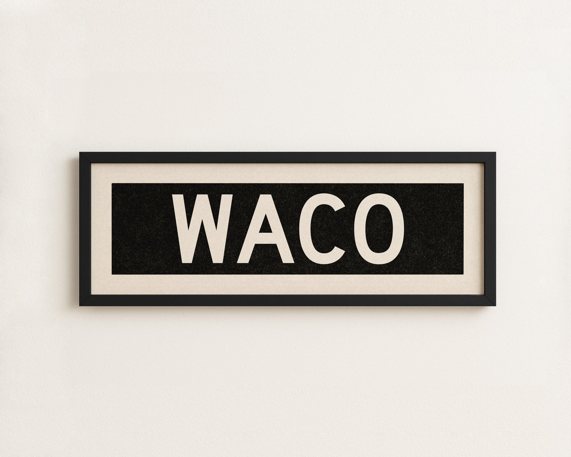 Framed "WACO" vintage bus/train scroll sign art. Show off your love for Waco with this classic and simple framed scroll sign. Perfect for above the door, in an office, game room or accent in a living area.