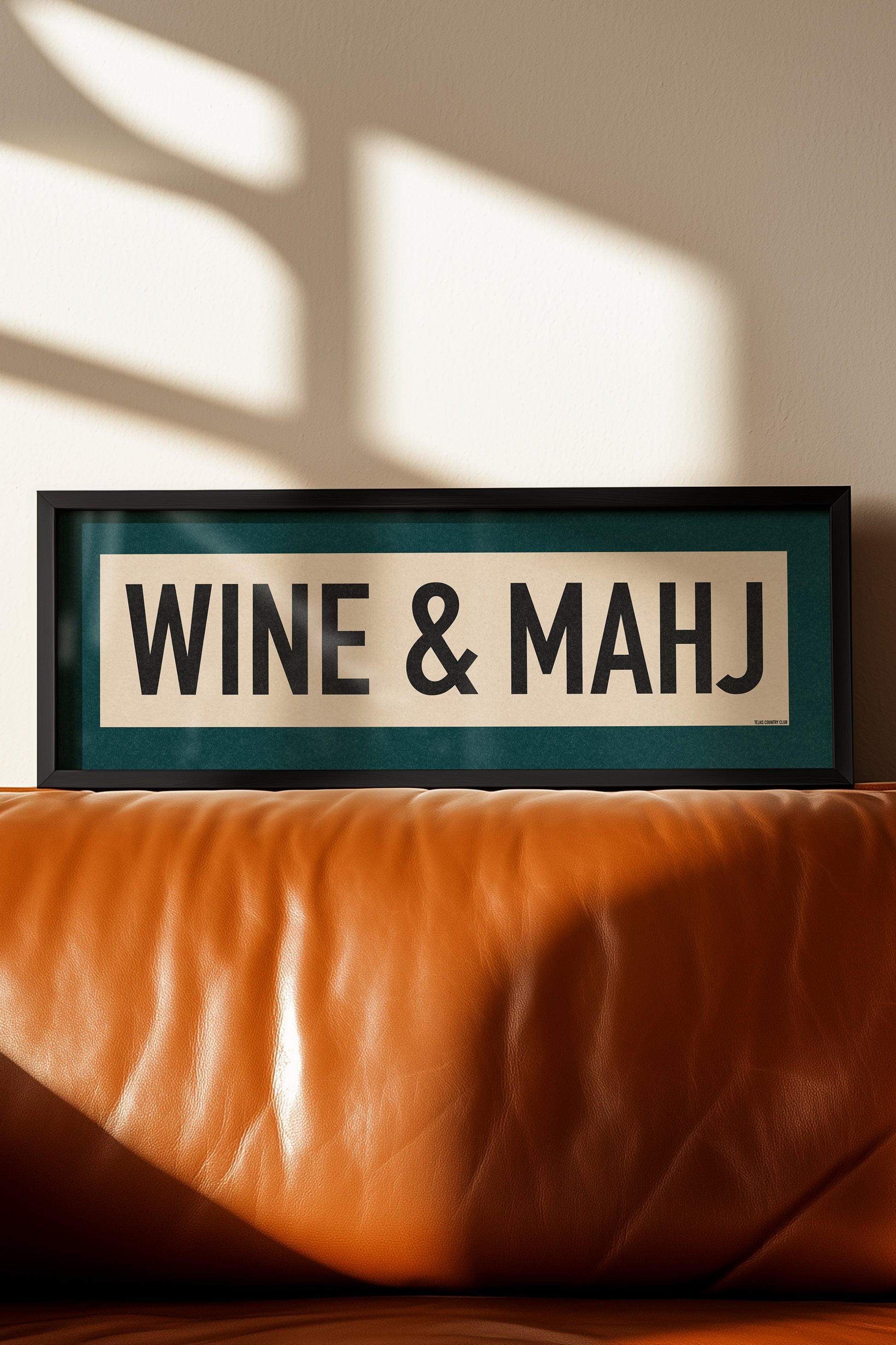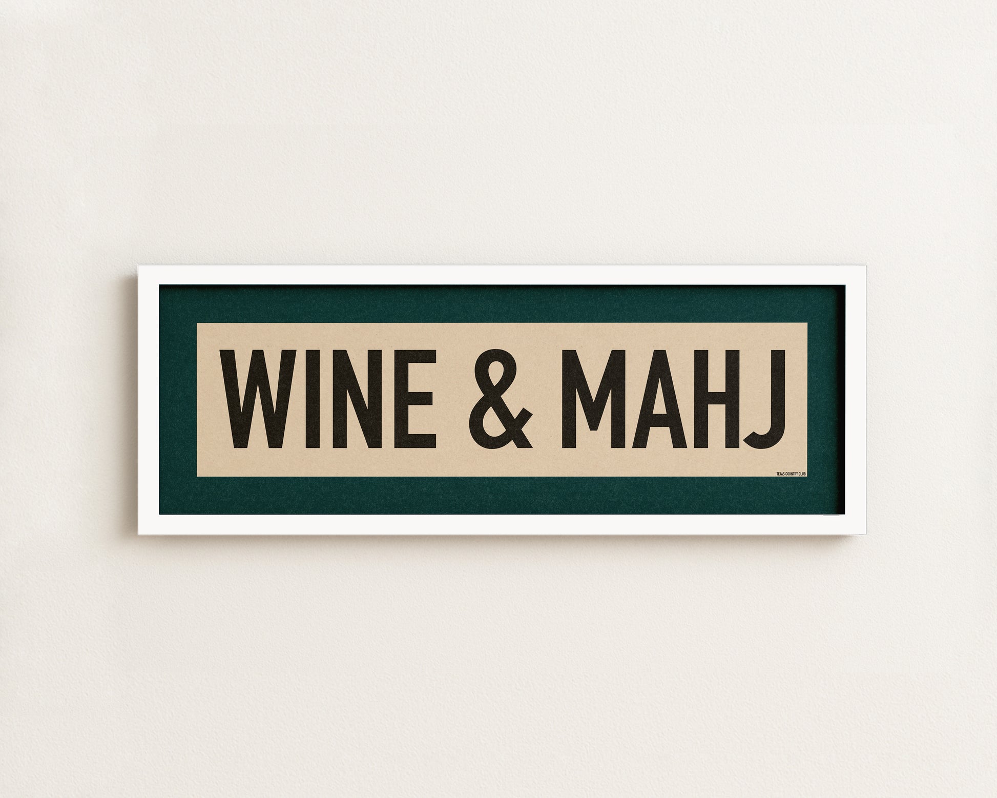 Framed teal and off white "WINE & MAHJ" vintage scroll sign art. What a perfect combination, wine and Mahjong.....and some great friends. Liven up that wall with this classic and simple framed scroll sign. for above the door, in an office, game room or accent in a living area.