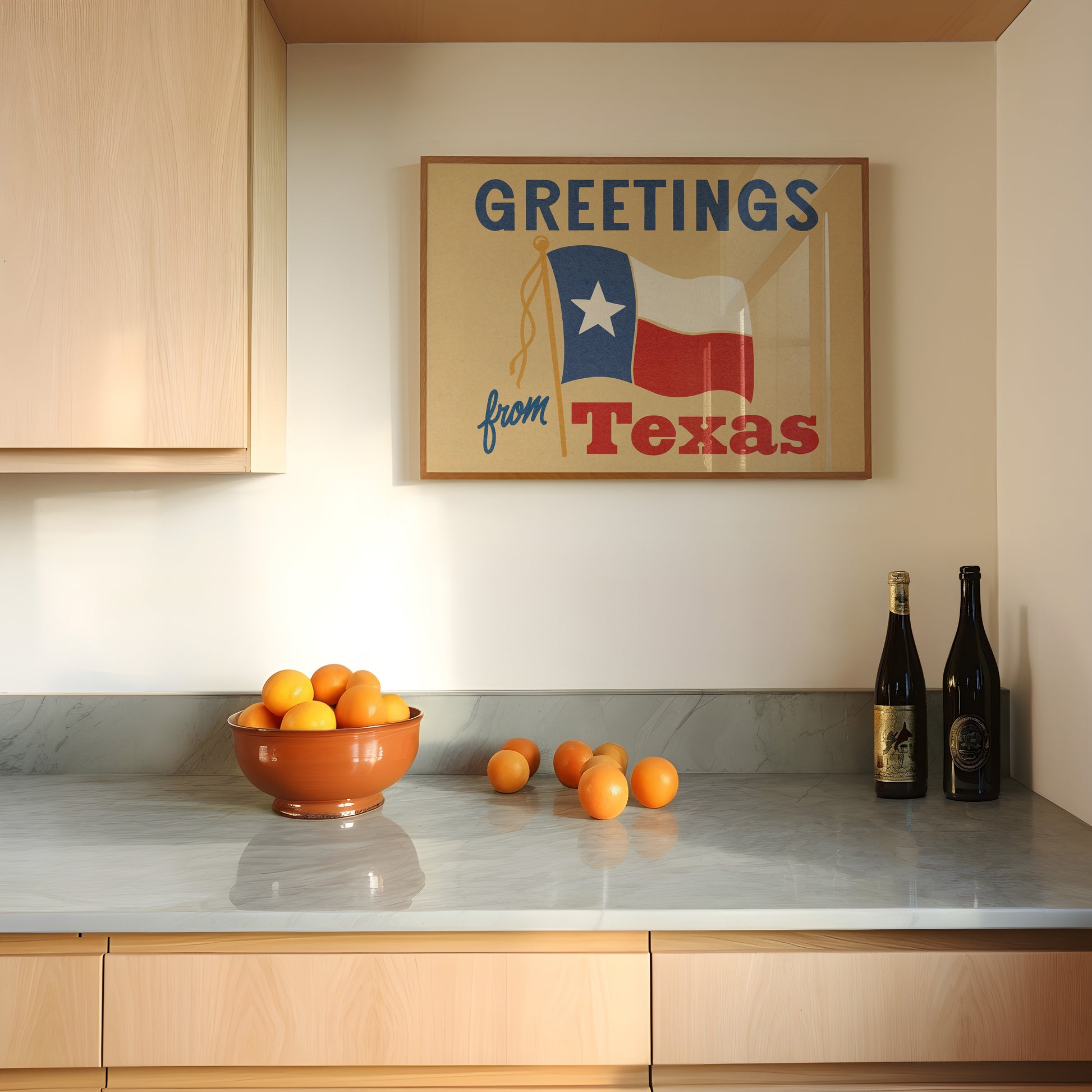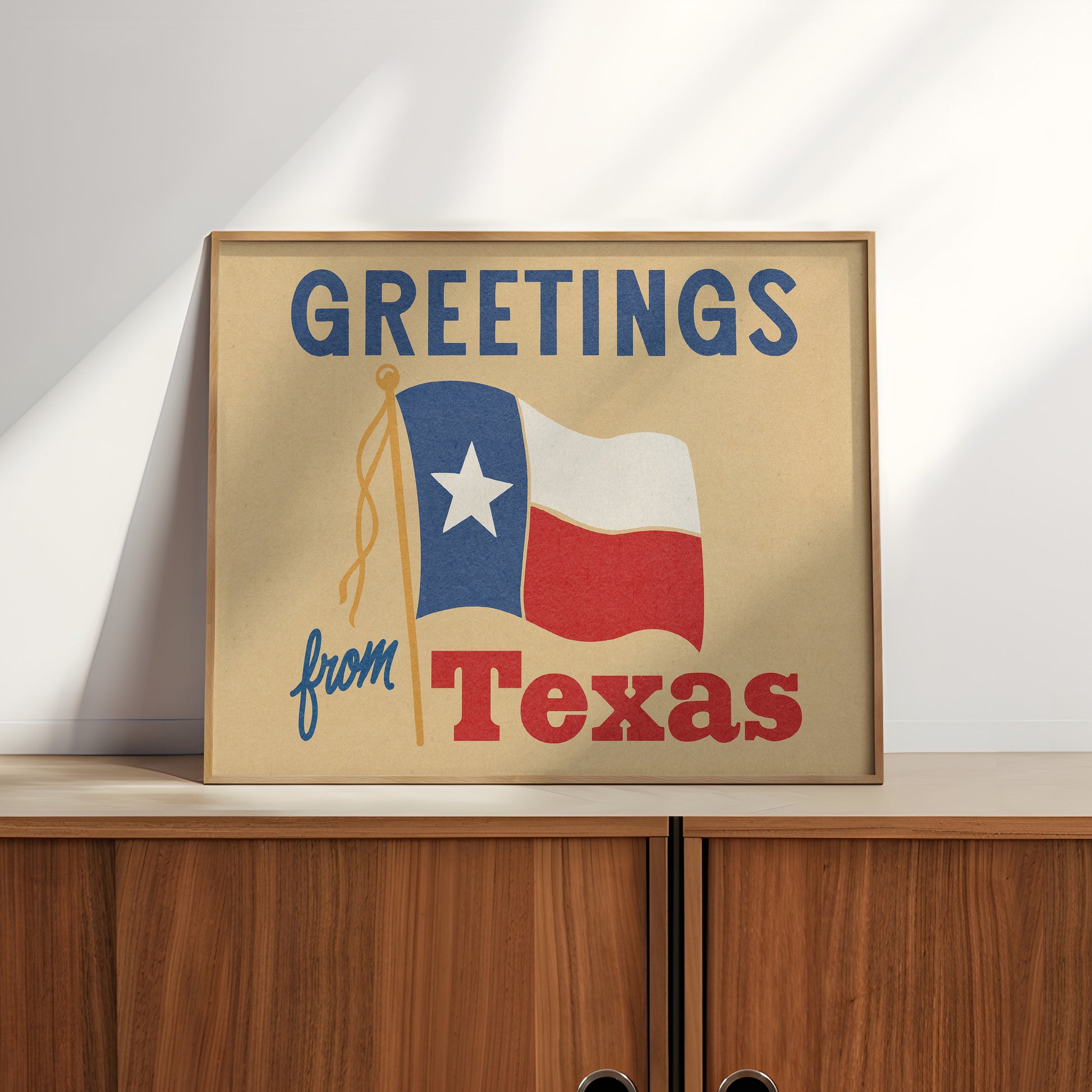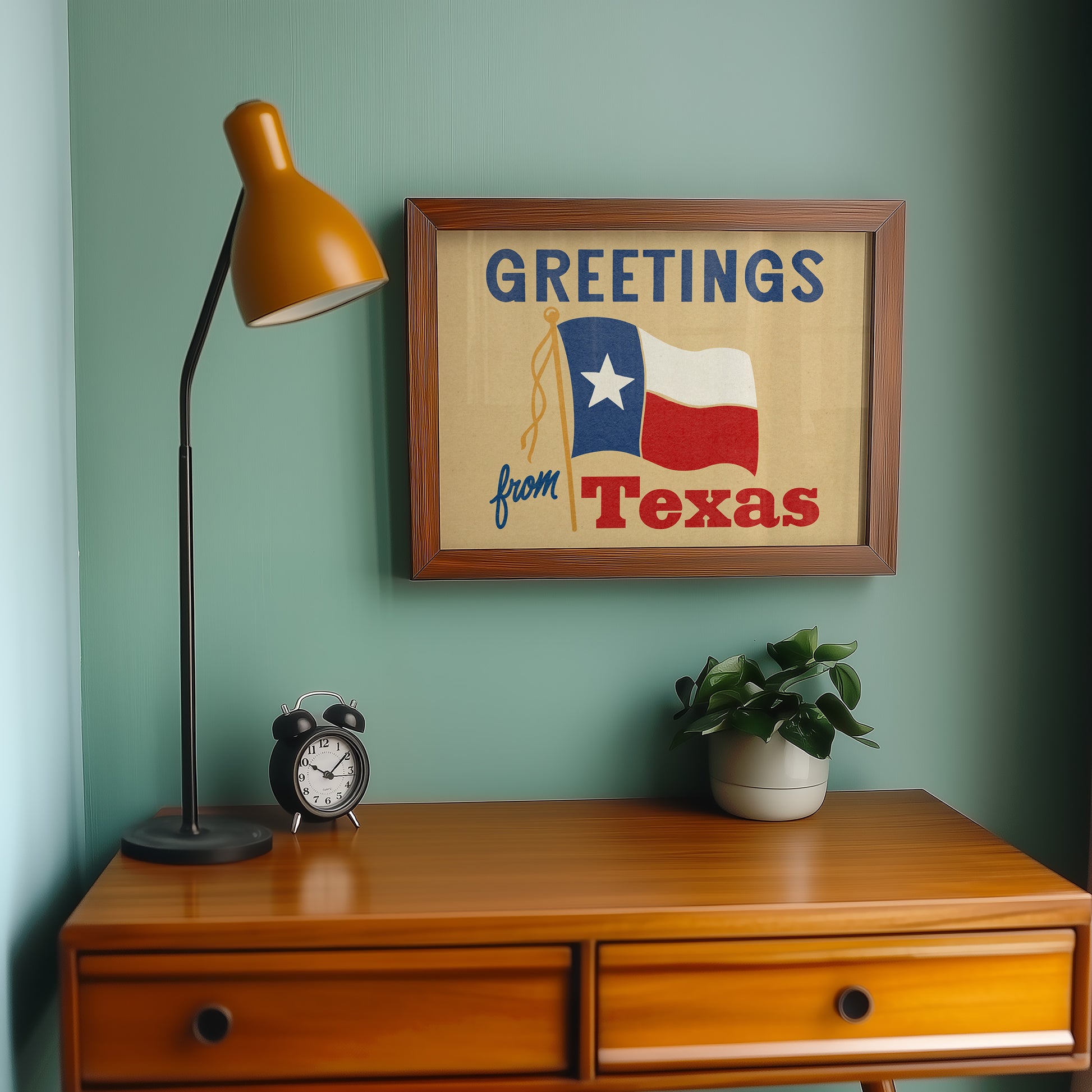 • High-quality unframed print featuring the Texas flag with "GREETINGS from Texas" text on a warm beige background