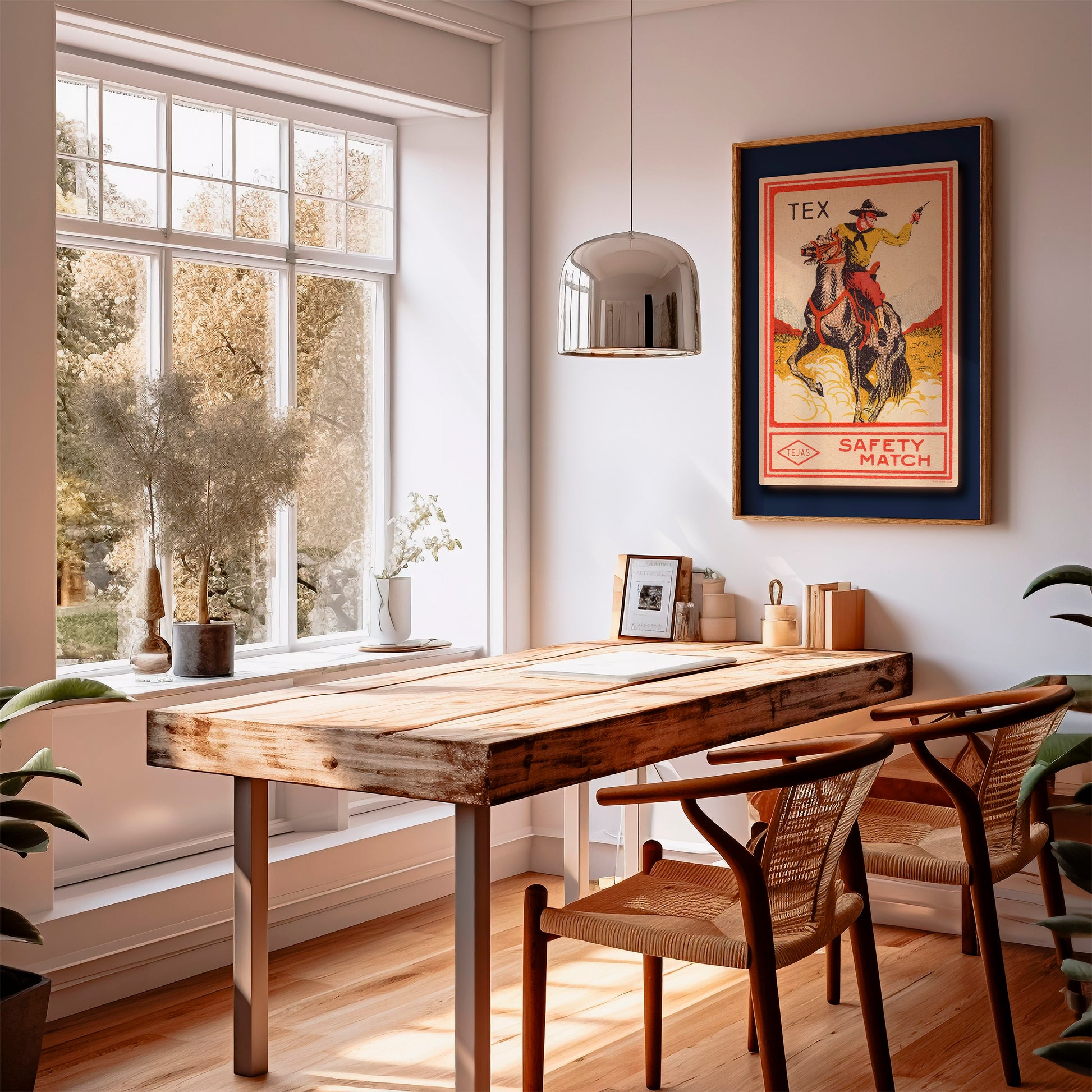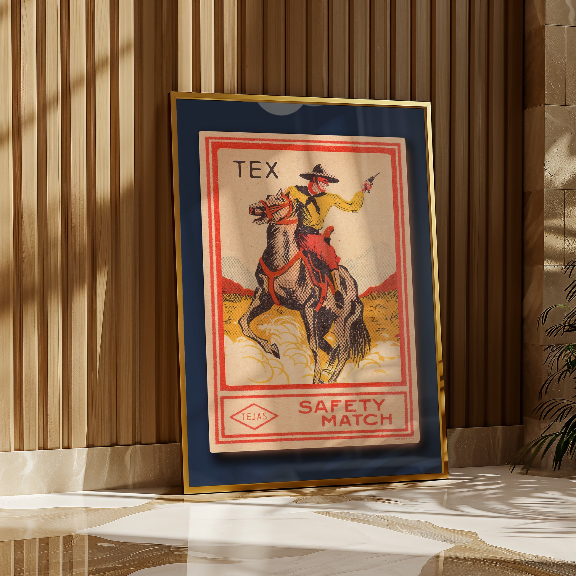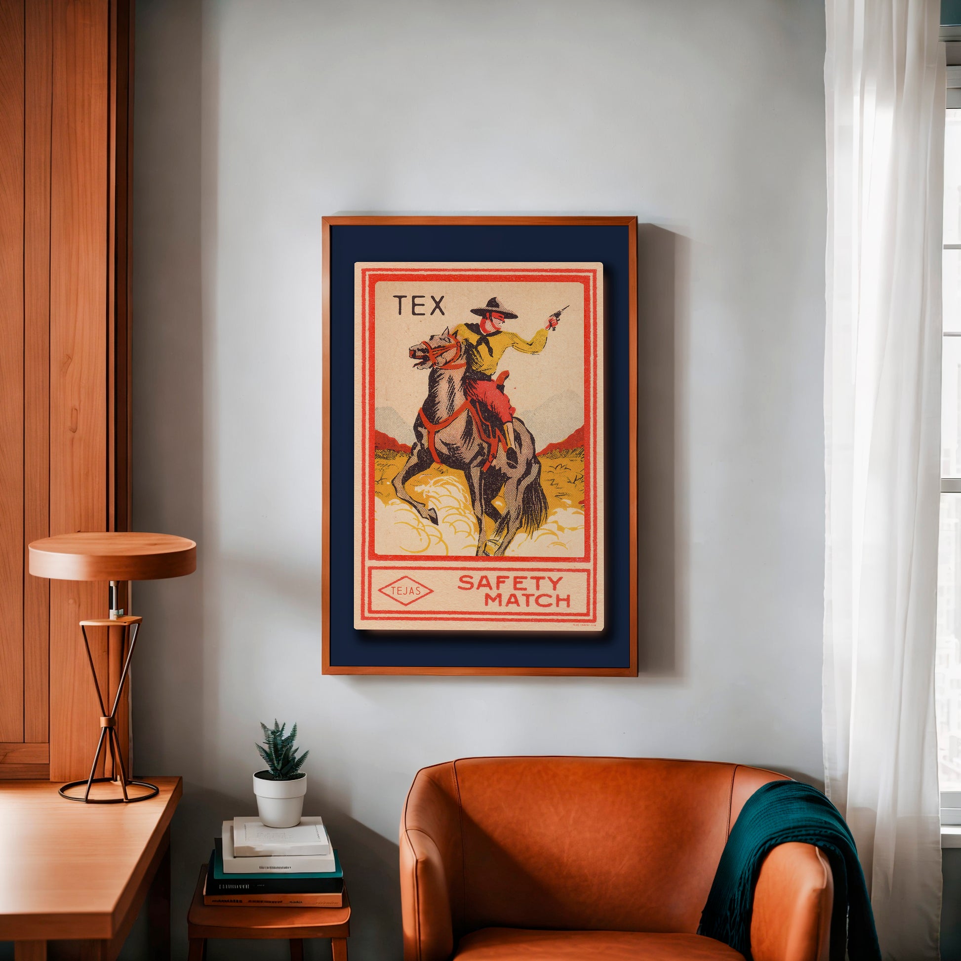 Tex Cowboy Vintage Style Matchbook Tejas Art Print. Beautiful western cowboy risograph style print that will look great in any home that wants a unique western flair added their home decor. Artwork mimics a screen printed matchbook and offset colors and pixels are intended.