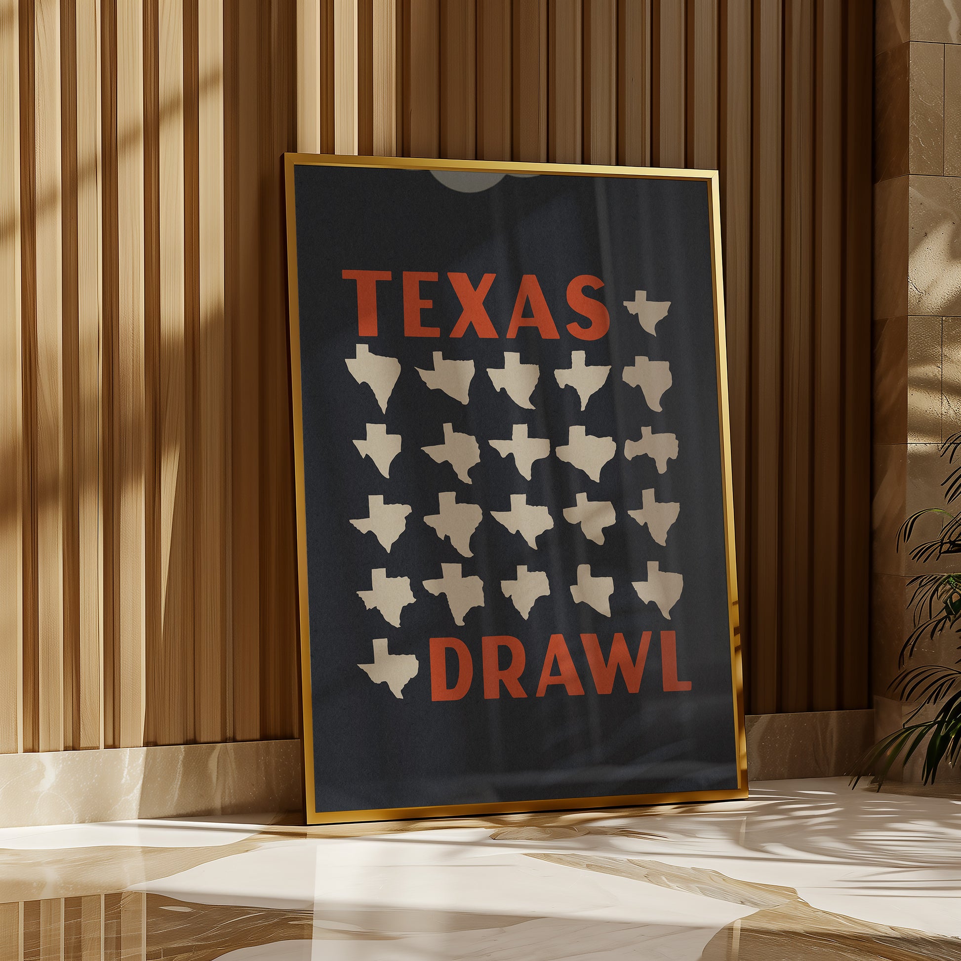Features "TEXAS" in bold red orange at the top and "DRAWL" at the bottom, framing multiple light gray state silhouettes drawn by high school art students