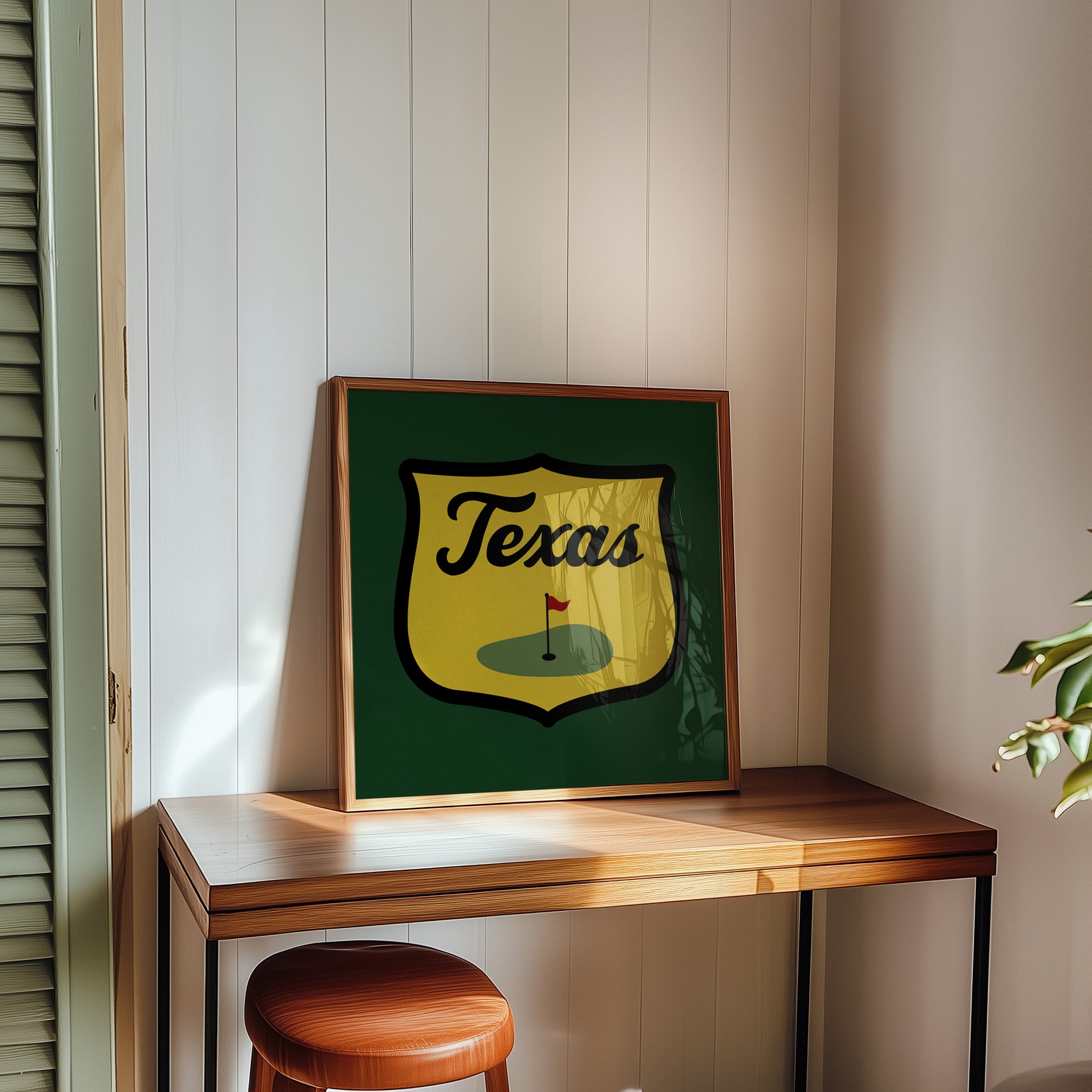 Elevate your man cave decoration with this stunning Texas golf print wall art featuring a square design shield style with a vintage aesthetic in elegant green and gold colors. This unique Texas decor piece makes the perfect gift for golfers, offering a stylish room accent idea that celebrates the Lone Star State's golfing heritage.