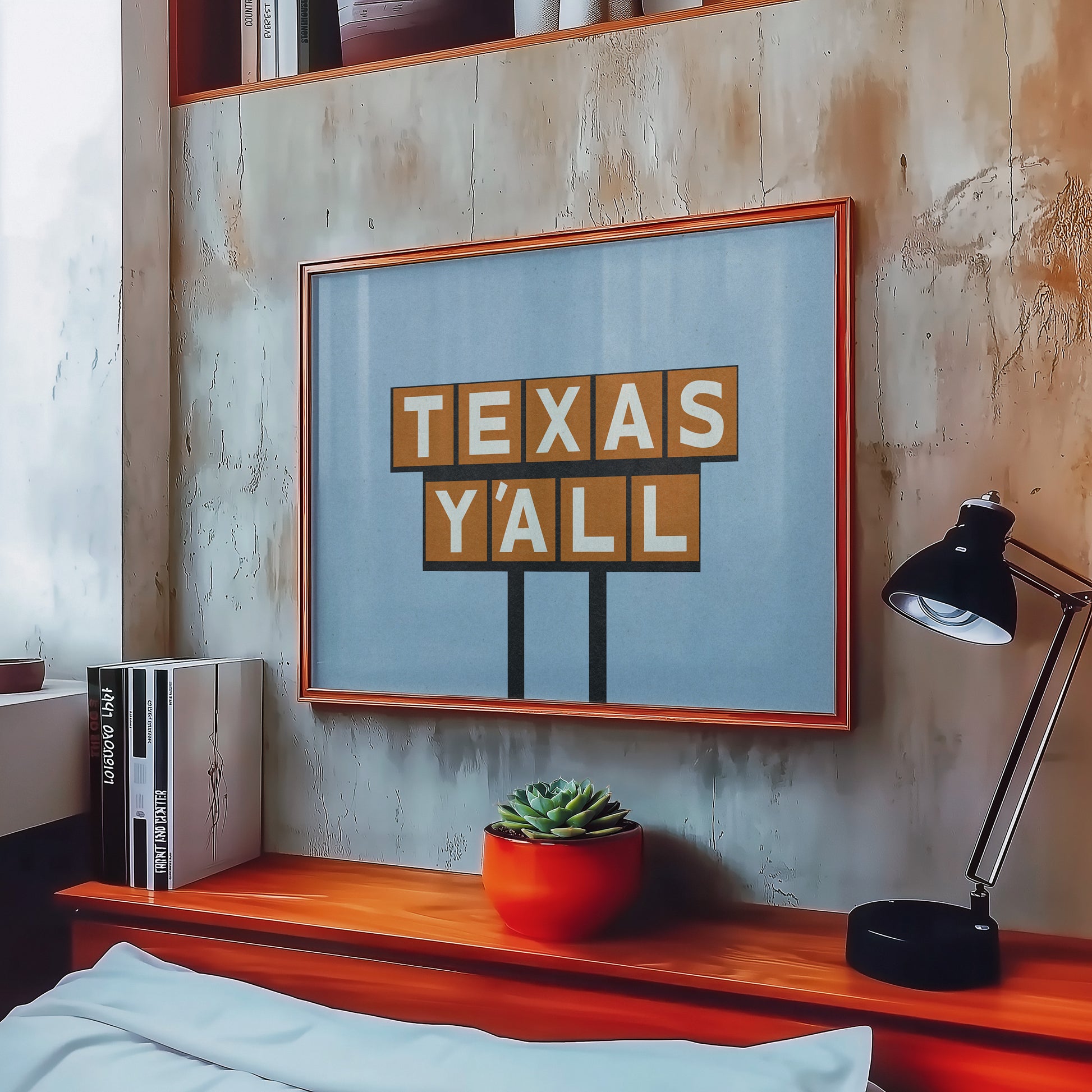 Transform your space with this unique Texas wall art print, featuring a vintage-inspired billboard road sign design that perfectly complements any man cave wall decoration or dorm room decor. This Texas pride display combines text and vintage postcard artwork elements, making it an ideal addition to your home decor or office space. Texas Y'all!