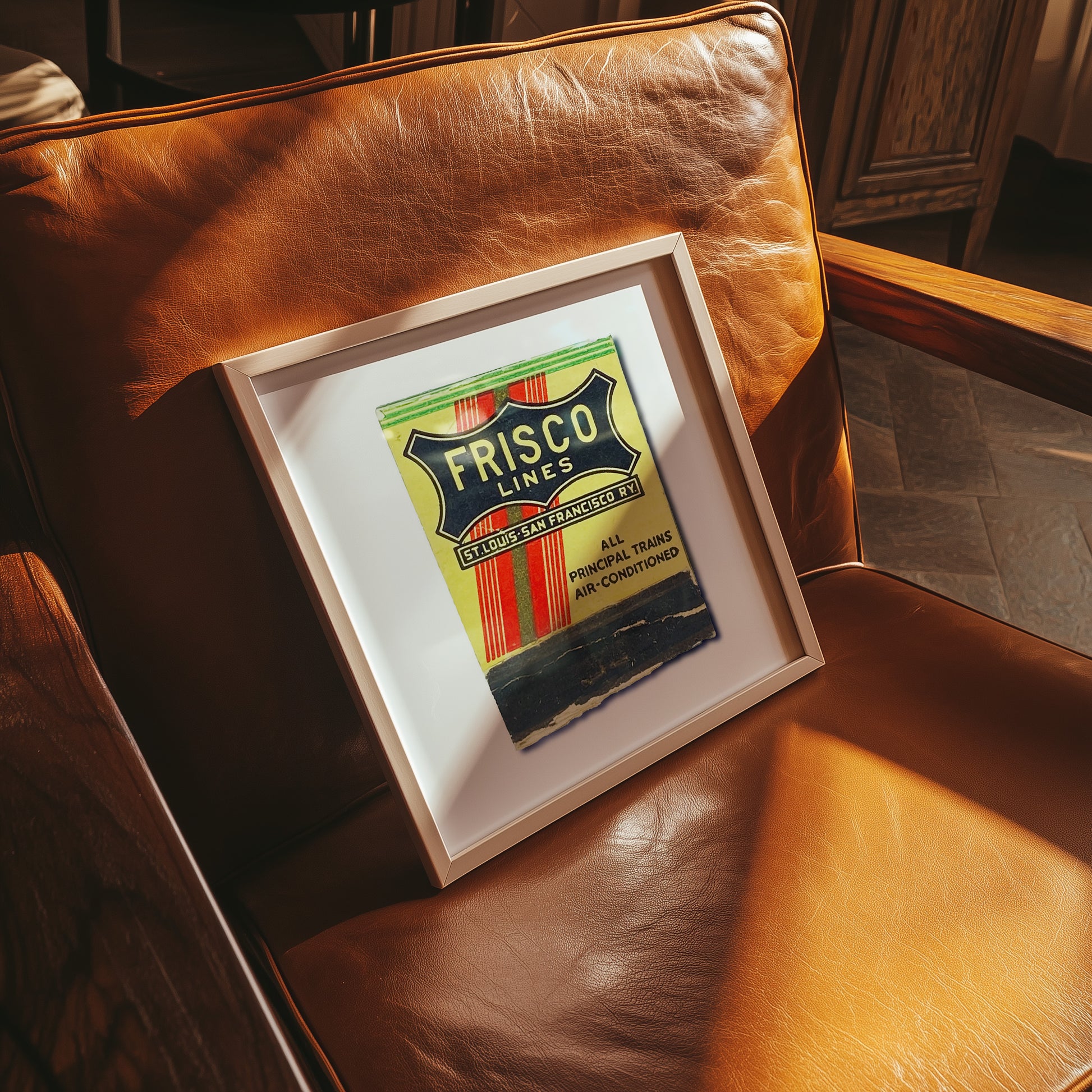 The iconic vintage Frisco Railroad. This a photography print of a matchbook depicting the brand in all it's glory. The print is square and comes in multiple size options. This is great for any lover of railroad and train history!